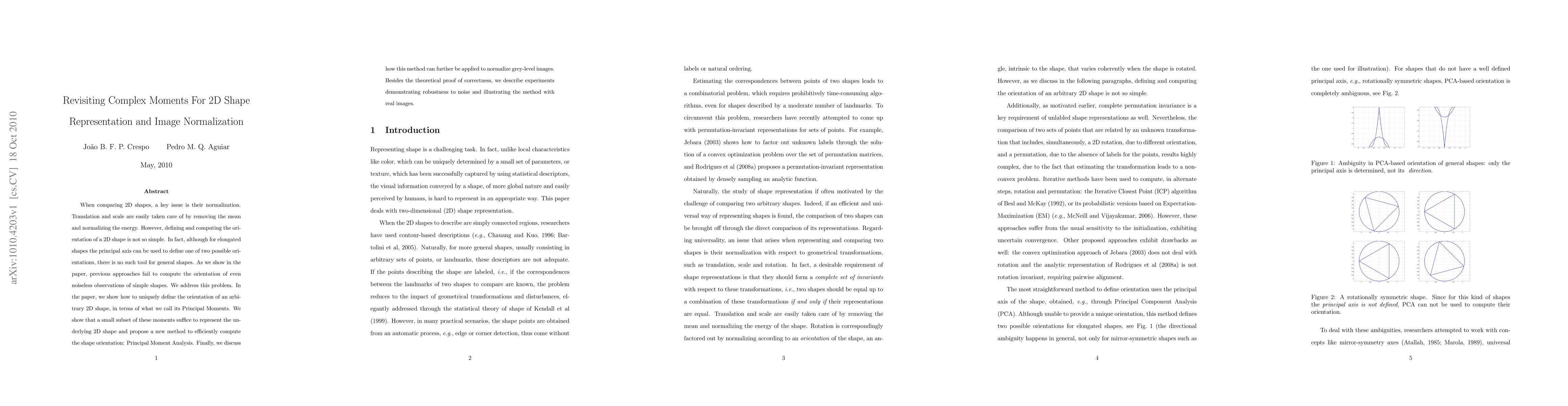When comparing 2D shapes, a key issue is their normalization. Translation and scale are easily taken care of by removing the mean and normalizing the energy. However, defining and computing the orientation of a 2D shape is not so simple. In fact, although for elongated shapes the principal axis can be used to define one of two possible orientations, there is no such tool for general shapes. As we show in the paper, previous approaches fail to compute the orientation of even noiseless observations of simple shapes. We address this problem. In the paper, we show how to uniquely define the orientation of an arbitrary 2D shape, in terms of what we call its Principal Moments. We show that a small subset of these moments suffice to represent the underlying 2D shape and propose a new method to efficiently compute the shape orientation: Principal Moment Analysis. Finally, we discuss how this method can further be applied to normalize grey-level images. Besides the theoretical proof of correctness, we describe experiments demonstrating robustness to noise and illustrating the method with real images.