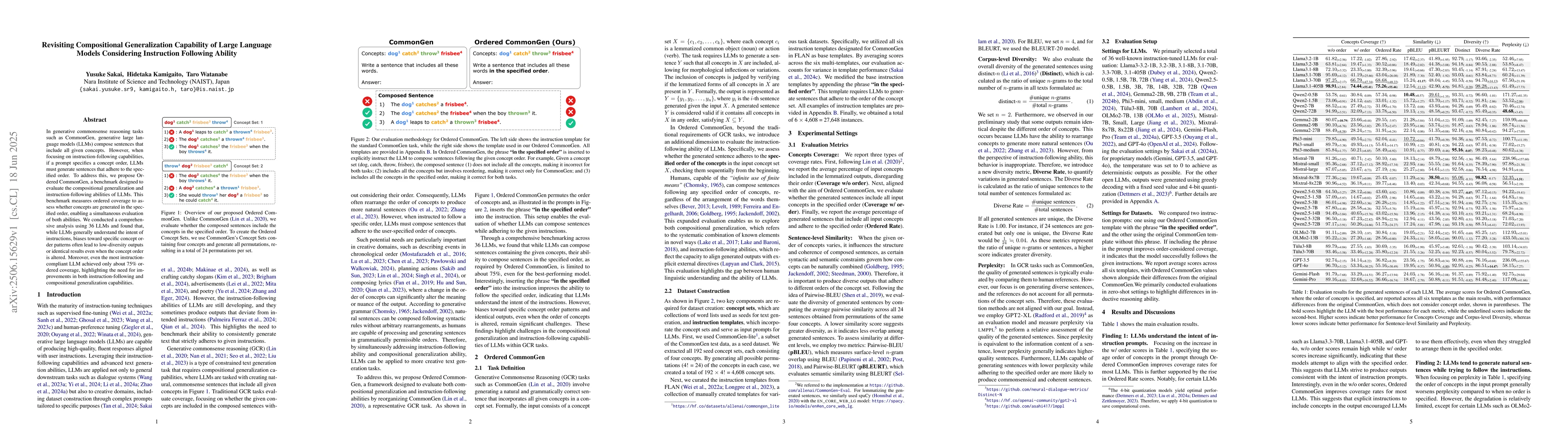 In generative commonsense reasoning tasks such as CommonGen, generative large language models (LLMs) compose sentences that include all given concepts. However, when focusing on instruction-following capabilities, if a prompt specifies a concept order, LLMs must generate sentences that adhere to the specified order. To address this, we propose Ordered CommonGen, a benchmark designed to evaluate the compositional generalization and instruction-following abilities of LLMs. This benchmark measures ordered coverage to assess whether concepts are generated in the specified order, enabling a simultaneous evaluation of both abilities. We conducted a comprehensive analysis using 36 LLMs and found that, while LLMs generally understand the intent of instructions, biases toward specific concept order patterns often lead to low-diversity outputs or identical results even when the concept order is altered. Moreover, even the most instruction-compliant LLM achieved only about 75% ordered coverage, highlighting the need for improvements in both instruction-following and compositional generalization capabilities.