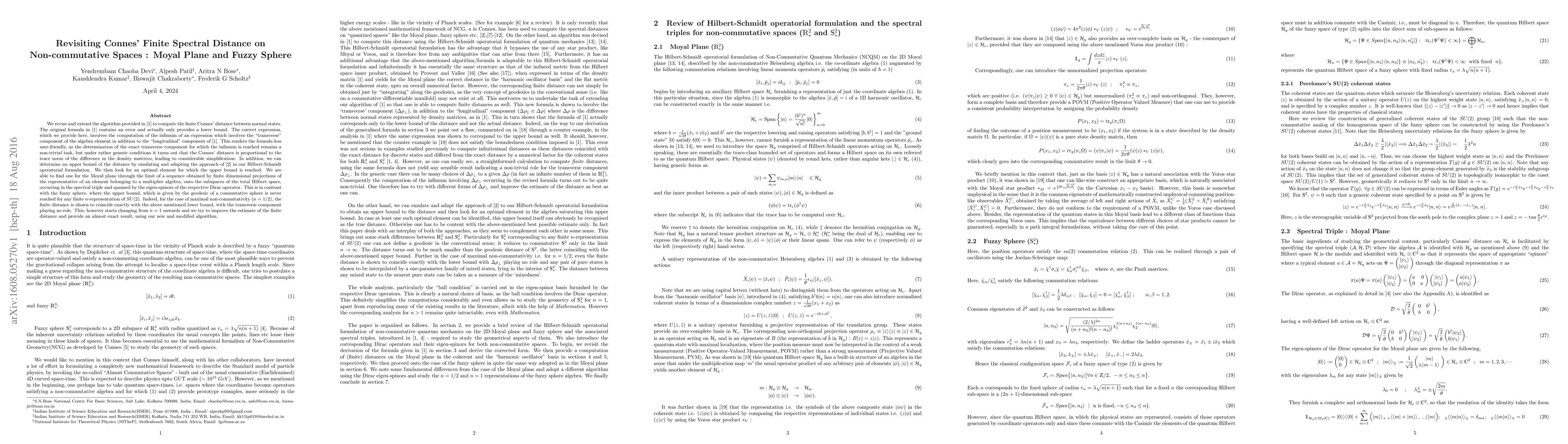 We revise and extend the algorithm provided in [1] to compute the finite Connes' distance between normal states. The original formula in [1] contains an error and actually only provides a lower bound. The correct expression, which we provide here, involves the computation of the infimum of an expression which involves the "transverse" component of the algebra element in addition to the "longitudinal" component of [1]. This renders the formula less user-friendly, as the determination of the exact transverse component for which the infimum is reached remains a non-trivial task, but under rather generic conditions it turns out that the Connes' distance is proportional to the trace norm of the difference in the density matrices, leading to considerable simplification. In addition, we can determine an upper bound of the distance by emulating and adapting the approach of [2] in our Hilbert-Schmidt operatorial formulation. We then look for an optimal element for which the upper bound is reached. We are able to find one for the Moyal plane through the limit of a sequence obtained by finite dimensional projections of the representative of an element belonging to a multiplier algebra, onto the subspaces of the total Hilbert space, occurring in the spectral triple and spanned by the eigen-spinors of the respective Dirac operator. This is in contrast with the fuzzy sphere, where the upper bound, which is given by the geodesic of a commutative sphere is never reached for any finite $n$-representation of $SU(2)$. Indeed, for the case of maximal non-commutativity ($n = 1/2$), the finite distance is shown to coincide exactly with the above mentioned lower bound, with the transverse component playing no role. This, however starts changing from $n=1$ onwards and we try to improve the estimate of the finite distance and provide an almost exact result, using our new and modified algorithm.