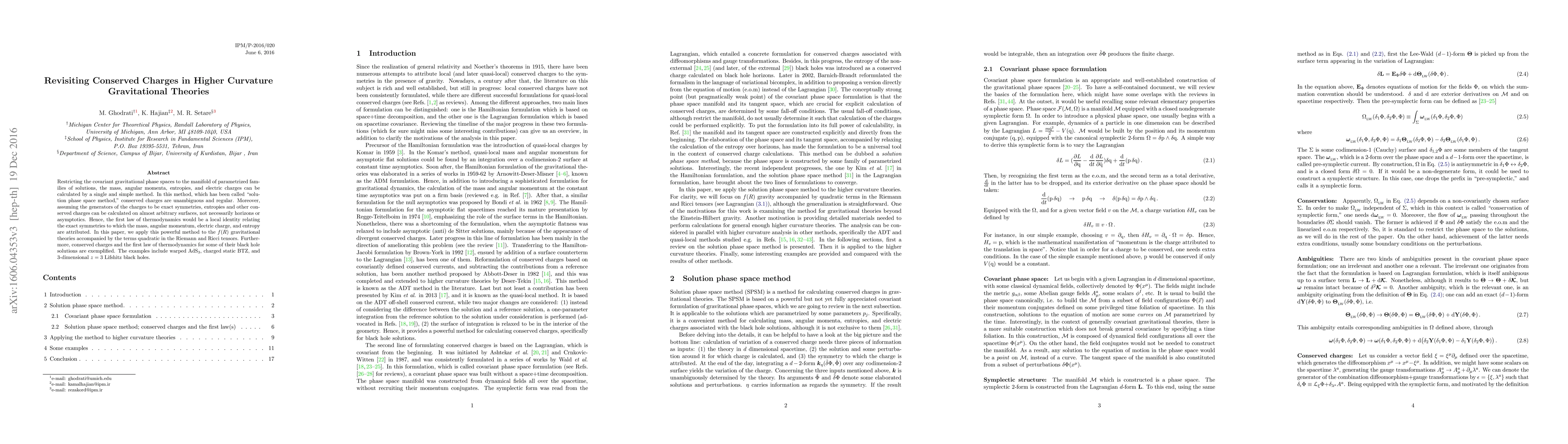 This paper revisits conserved charges in higher curvature gravitational theories using the "solution phase space method," showing that it can determine mass, angular momenta, entropies, and electric charges unambiguously. It applies this method to $f(R)$ theories and illustrates its utility through examples like warped AdS$_3$, charged static BTZ, and 3-dimensional $z=3$ Lifshitz black holes.