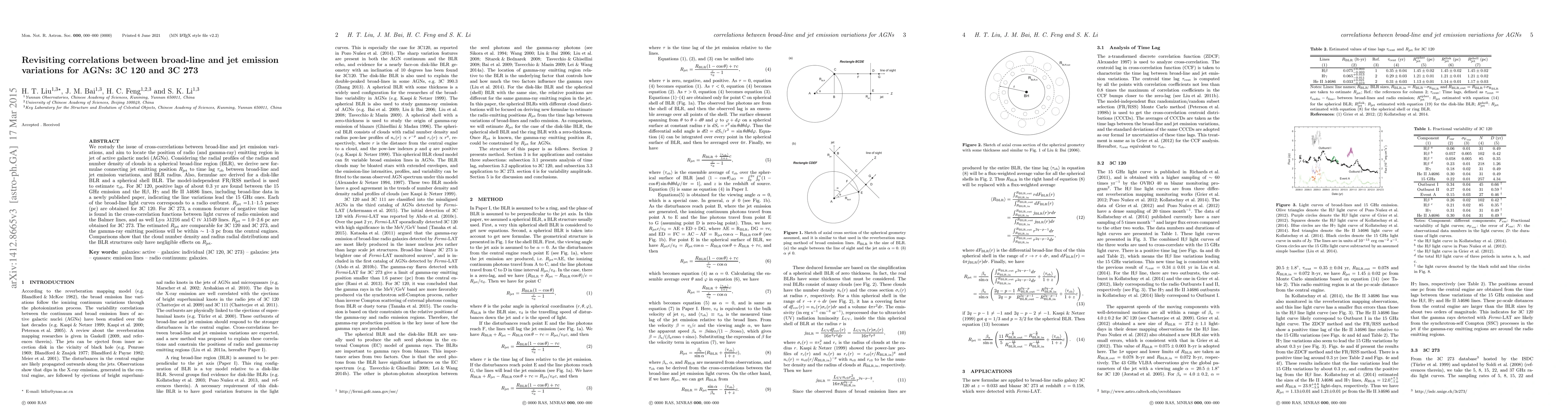 This paper revisits correlations between broad-line and jet emission variations in AGNs 3C 120 and 3C 273, deriving new formulae to locate radio and gamma-ray emitting regions in AGN jets. Results show positive lags for 3C 120 and negative lags for 3C 273, estimating jet emission regions at 1.1--1.5 pc and 1.0--2.6 pc respectively.