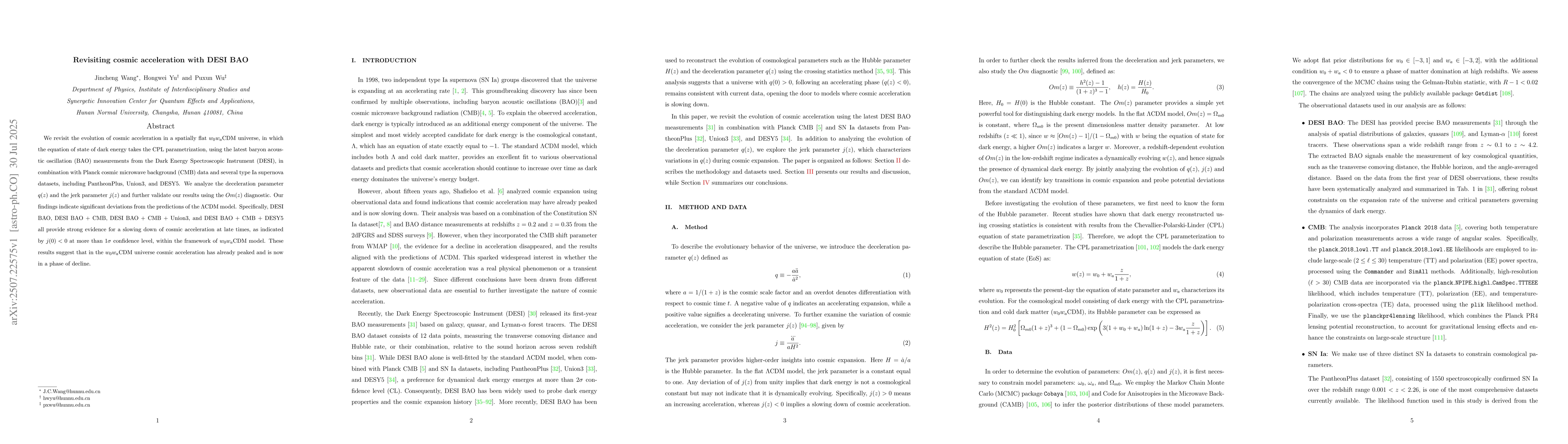 The research revisits the evolution of cosmic acceleration using the CPL parametrization for dark energy's equation of state in a spatially flat w0waCDM universe. It employs the latest baryon acoustic oscillation (BAO) measurements from the Dark Energy Spectroscopic Instrument (DESI), combined with Planck cosmic microwave background (CMB) data and several type Ia supernova datasets, including PantheonPlus, Union3, and DESY5.