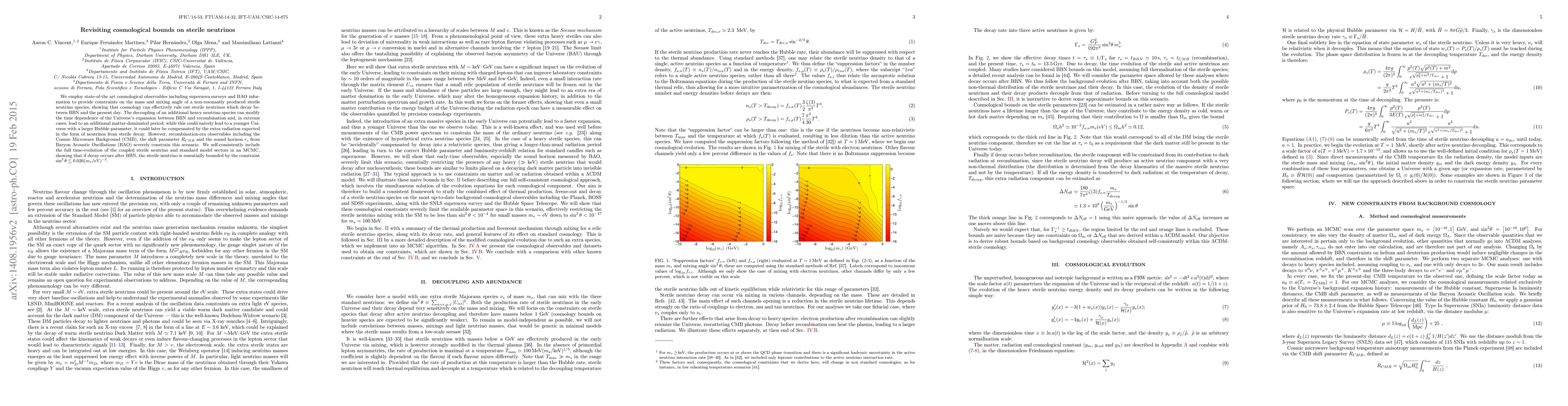 We employ state-of-the art cosmological observables including supernova surveys and BAO information to provide constraints on the mass and mixing angle of a non-resonantly produced sterile neutrino species, showing that cosmology can effectively rule out sterile neutrinos which decay between BBN and the present day. The decoupling of an additional heavy neutrino species can modify the time dependence of the Universe's expansion between BBN and recombination and, in extreme cases, lead to an additional matter-dominated period; while this could naively lead to a younger Universe with a larger Hubble parameter, it could later be compensated by the extra radiation expected in the form of neutrinos from sterile decay. However, recombination-era observables including the Cosmic Microwave Background (CMB), the shift parameter $R_{CMB}$ and the sound horizon $r_s$ from Baryon Acoustic Oscillations (BAO) severely constrain this scenario. We self-consistently include the full time-evolution of the coupled sterile neutrino and standard model sectors in an MCMC, showing that if decay occurs after BBN, the sterile neutrino is essentially bounded by the constraint $\sin^2\theta \lesssim 0.026 (m_s/\mathrm{eV})^{-2}$.