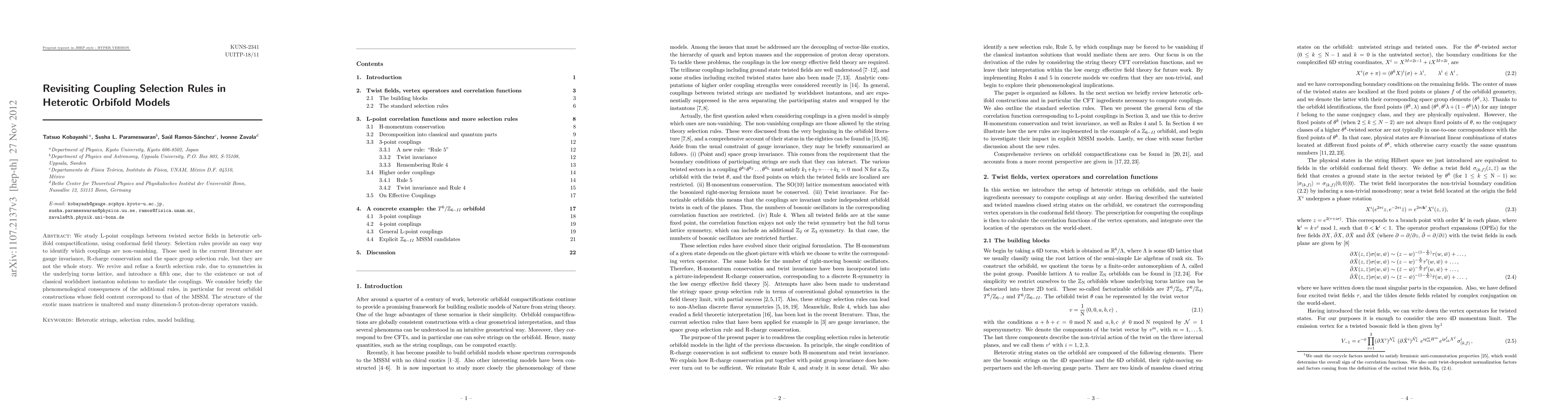 We study L-point couplings between twisted sector fields in heterotic orbifold compactifications, using conformal field theory. Selection rules provide an easy way to identify which couplings are non-vanishing. Those used in the current literature are gauge invariance, R-charge conservation and the space group selection rule, but they are not the whole story. We revive and refine a fourth selection rule, due to symmetries in the underlying torus lattice, and introduce a fifth one, due to the existence or not of classical worldsheet instanton solutions to mediate the couplings. We consider briefly the phenomenological consequences of the additional rules, in particular for recent orbifold constructions whose field content correspond to that of the MSSM. The structure of the exotic mass matrices is unaltered and many dimension-5 proton-decay operators vanish.