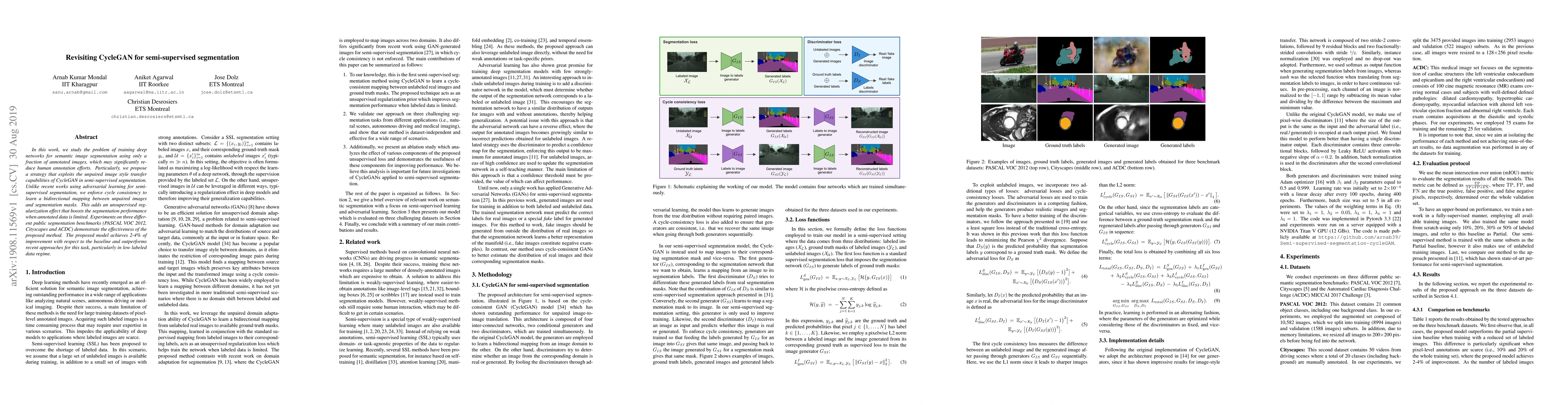 This research proposes a semi-supervised segmentation method leveraging CycleGAN's unpaired image style transfer, enforcing cycle consistency for bidirectional mapping. Experiments show a 2-4% improvement over baselines and outperform recent methods, especially with limited labeled data.