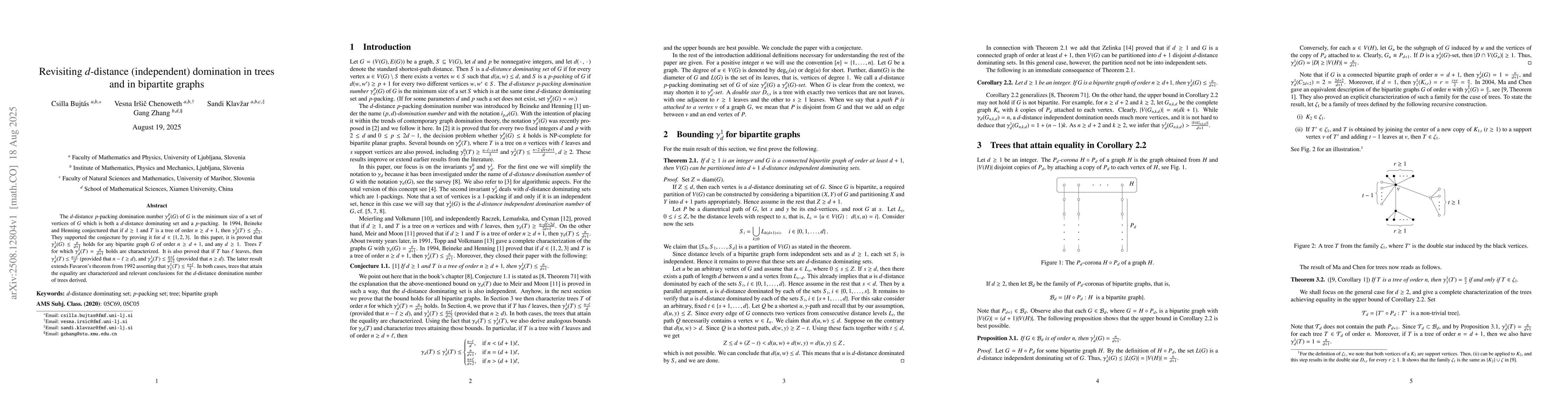 The $d$-distance $p$-packing domination number $\gamma_d^p(G)$ of $G$ is the minimum size of a set of vertices of $G$ which is both a $d$-distance dominating set and a $p$-packing. In 1994, Beineke and Henning conjectured that if $d\ge 1$ and $T$ is a tree of order $n \geq d+1$, then $\gamma_d^1(T) \leq \frac{n}{d+1}$. They supported the conjecture by proving it for $d\in \{1,2,3\}$. In this paper, it is proved that $\gamma_d^1(G) \leq \frac{n}{d+1}$ holds for any bipartite graph $G$ of order $n \geq d+1$, and any $d\ge 1$. Trees $T$ for which $\gamma_d^1(T) = \frac{n}{d+1}$ holds are characterized. It is also proved that if $T$ has $\ell$ leaves, then $\gamma_d^1(T) \leq \frac{n-\ell}{d}$ (provided that $n-\ell \geq d$), and $\gamma_d^1(T) \leq \frac{n+\ell}{d+2}$ (provided that $n\geq d$). The latter result extends Favaron's theorem from 1992 asserting that $\gamma_1^1(T) \leq \frac{n+\ell}{3}$. In both cases, trees that attain the equality are characterized and relevant conclusions for the $d$-distance domination number of trees derived.