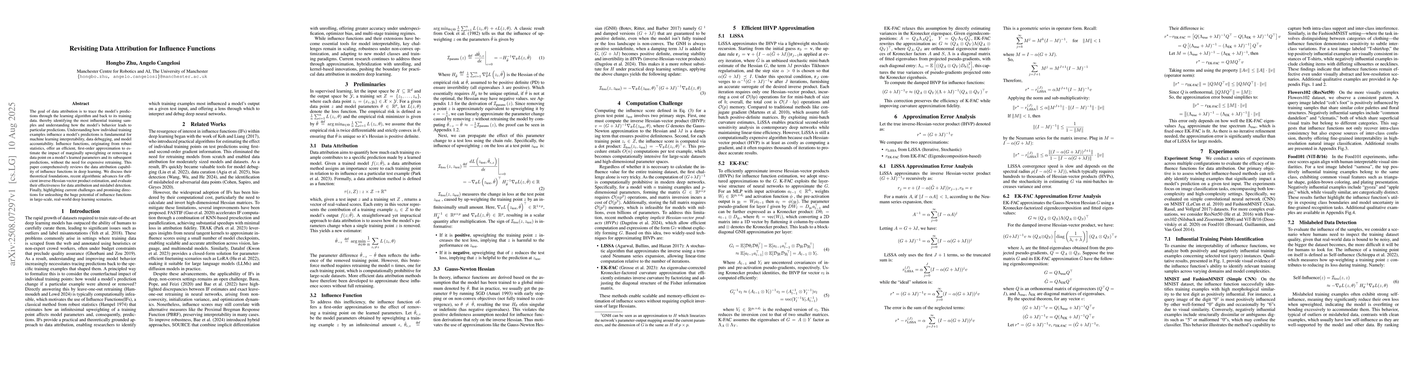 The goal of data attribution is to trace the model's predictions through the learning algorithm and back to its training data. thereby identifying the most influential training samples and understanding how the model's behavior leads to particular predictions. Understanding how individual training examples influence a model's predictions is fundamental for machine learning interpretability, data debugging, and model accountability. Influence functions, originating from robust statistics, offer an efficient, first-order approximation to estimate the impact of marginally upweighting or removing a data point on a model's learned parameters and its subsequent predictions, without the need for expensive retraining. This paper comprehensively reviews the data attribution capability of influence functions in deep learning. We discuss their theoretical foundations, recent algorithmic advances for efficient inverse-Hessian-vector product estimation, and evaluate their effectiveness for data attribution and mislabel detection. Finally, highlighting current challenges and promising directions for unleashing the huge potential of influence functions in large-scale, real-world deep learning scenarios.