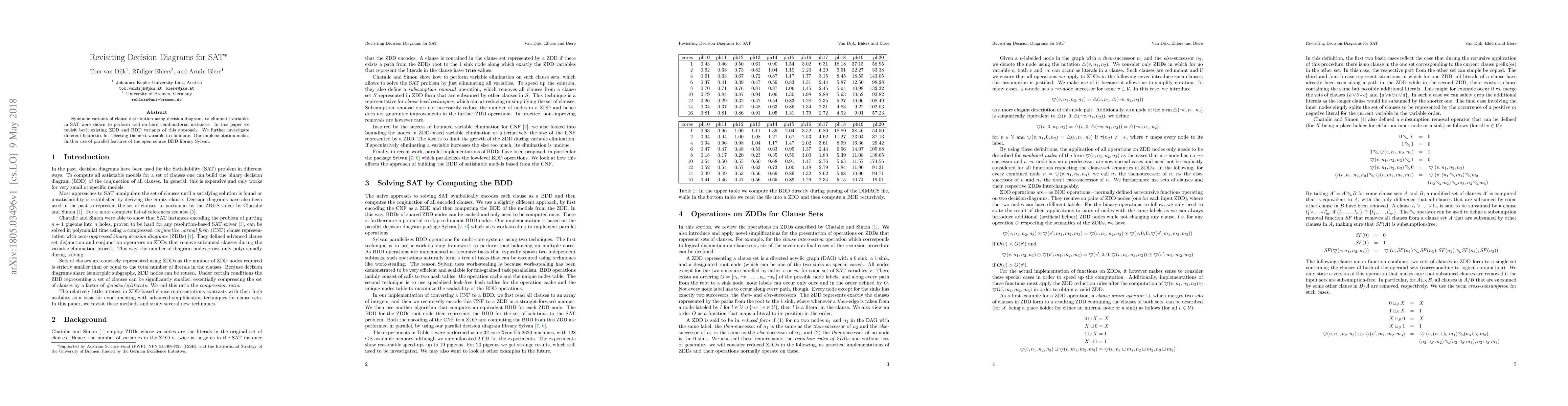 This paper revisits the use of decision diagrams, specifically ZDD and BDD variants, for solving SAT problems by eliminating variables. It explores various heuristics for variable selection and leverages parallel processing capabilities from the Sylvan library to enhance performance.