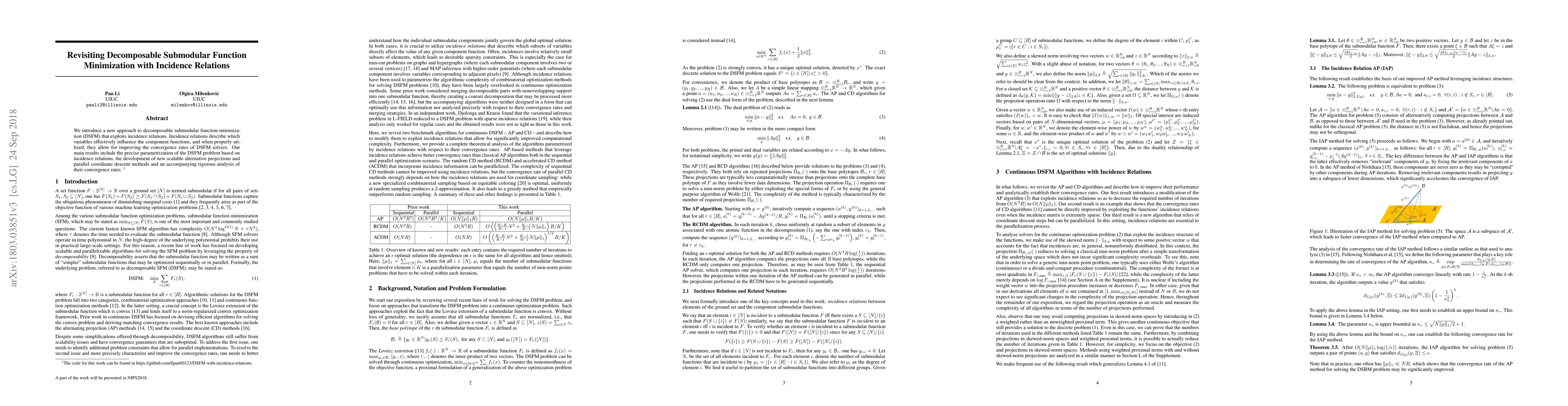 This paper presents a novel approach to decomposable submodular function minimization (DSFM) leveraging incidence relations to improve solver convergence rates. It introduces scalable alternative projection and parallel coordinate descent methods with rigorous convergence analysis.