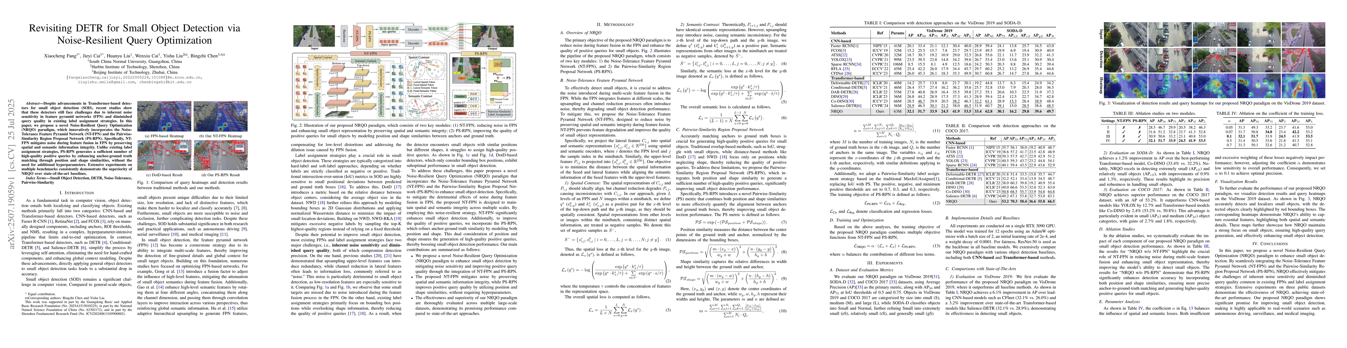 Despite advancements in Transformer-based detectors for small object detection (SOD), recent studies show that these detectors still face challenges due to inherent noise sensitivity in feature pyramid networks (FPN) and diminished query quality in existing label assignment strategies. In this paper, we propose a novel Noise-Resilient Query Optimization (NRQO) paradigm, which innovatively incorporates the Noise-Tolerance Feature Pyramid Network (NT-FPN) and the Pairwise-Similarity Region Proposal Network (PS-RPN). Specifically, NT-FPN mitigates noise during feature fusion in FPN by preserving spatial and semantic information integrity. Unlike existing label assignment strategies, PS-RPN generates a sufficient number of high-quality positive queries by enhancing anchor-ground truth matching through position and shape similarities, without the need for additional hyperparameters. Extensive experiments on multiple benchmarks consistently demonstrate the superiority of NRQO over state-of-the-art baselines.
