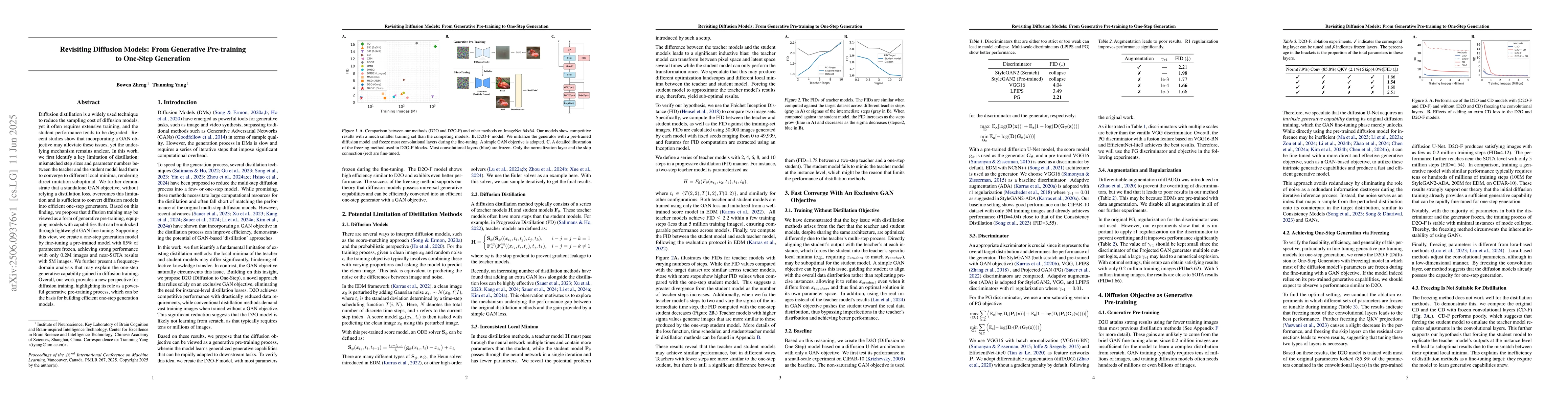 The paper proposes D2O, a model with a GAN objective to circumvent distillation limitations, and demonstrates that diffusion training can be viewed as generative pre-training, rapidly fine-tuned for one-step generation.