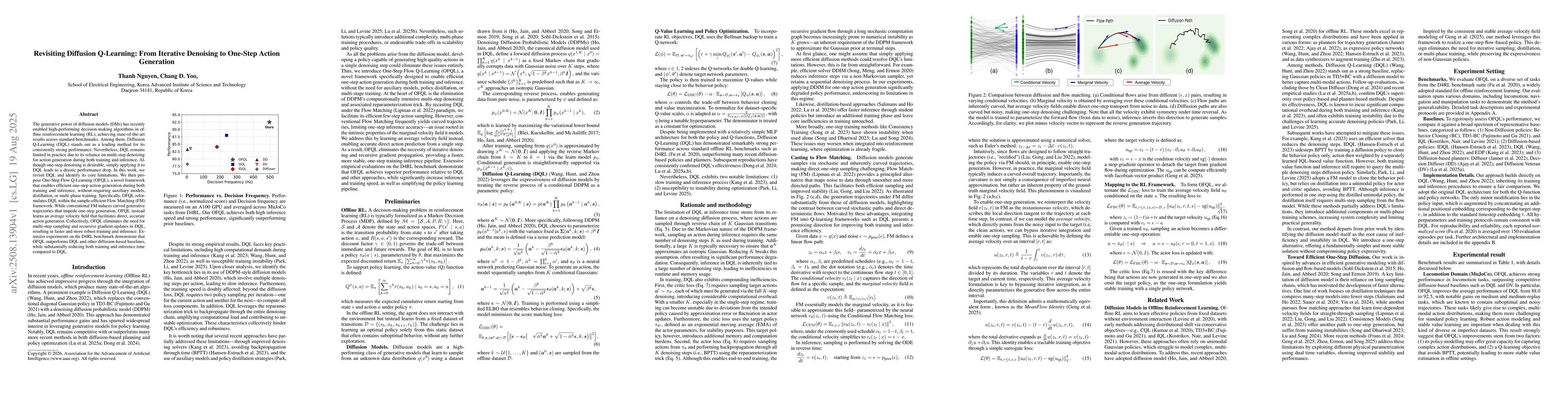 The generative power of diffusion models (DMs) has recently enabled high-performing decision-making algorithms in offline reinforcement learning (RL), achieving state-of-the-art results across standard benchmarks. Among them, Diffusion Q-Learning (DQL) stands out as a leading method for its consistently strong performance. Nevertheless, DQL remains limited in practice due to its reliance on multi-step denoising for action generation during both training and inference. Although one-step denoising is desirable, simply applying it to DQL leads to a drastic performance drop. In this work, we revisit DQL and identify its core limitations. We then propose One-Step Flow Q-Learning (OFQL), a novel framework that enables efficient one-step action generation during both training and inference, without requiring auxiliary models, distillation, or multi-phase training. Specifically, OFQL reformulates DQL within the sample-efficient Flow Matching (FM) framework. While conventional FM induces curved generative trajectories that impede one-step generation, OFQL instead learns an average velocity field that facilitates direct, accurate action generation. Collectively, OFQL eliminates the need for multi-step sampling and recursive gradient updates in DQL, resulting in faster and more robust training and inference. Extensive experiments on the D4RL benchmark demonstrate that OFQL outperforms DQL and other diffusion-based baselines, while substantially reducing both training and inference time compared to DQL.