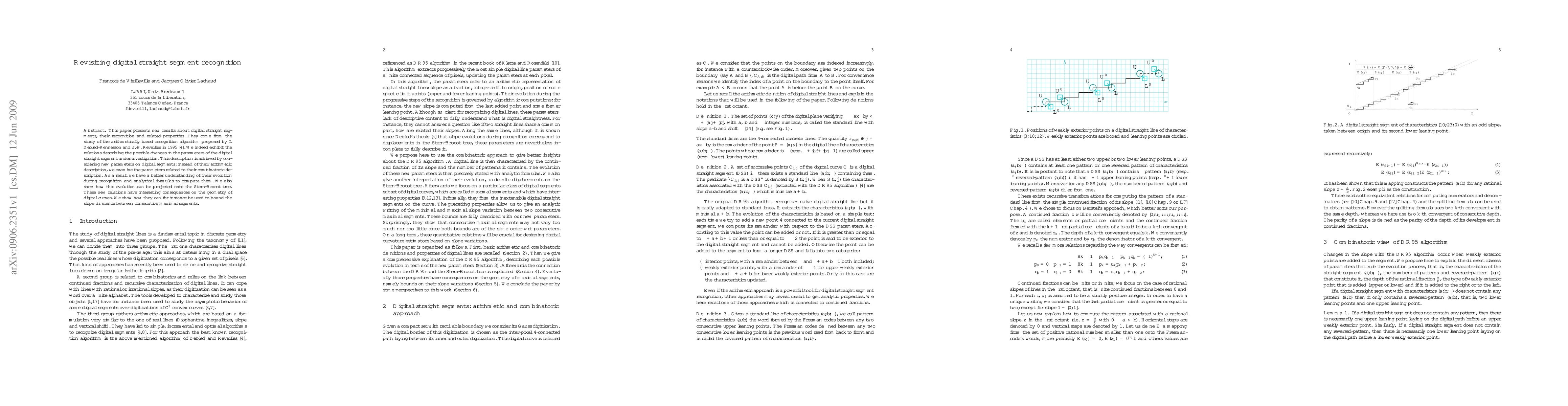 This paper presents new results about digital straight segments, their recognition and related properties. They come from the study of the arithmetically based recognition algorithm proposed by I. Debled-Rennesson and J.-P. Reveill\`es in 1995 [Debled95]. We indeed exhibit the relations describing the possible changes in the parameters of the digital straight segment under investigation. This description is achieved by considering new parameters on digital segments: instead of their arithmetic description, we examine the parameters related to their combinatoric description. As a result we have a better understanding of their evolution during recognition and analytical formulas to compute them. We also show how this evolution can be projected onto the Stern-Brocot tree. These new relations have interesting consequences on the geometry of digital curves. We show how they can for instance be used to bound the slope difference between consecutive maximal segments.