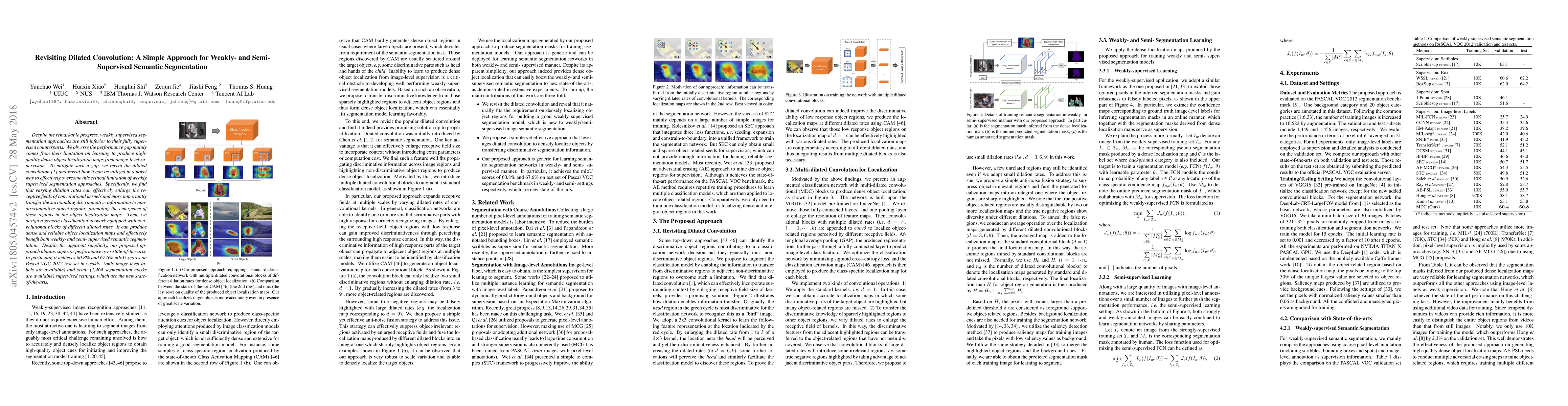 This paper proposes a simple yet effective approach using varied dilation rates in dilated convolutions to enhance weakly- and semi-supervised semantic segmentation. The method enlarges receptive fields and transfers discriminative information, leading to superior performance with 60.8% and 67.6% mIoU on Pascal VOC 2012, outperforming existing state-of-the-art methods.