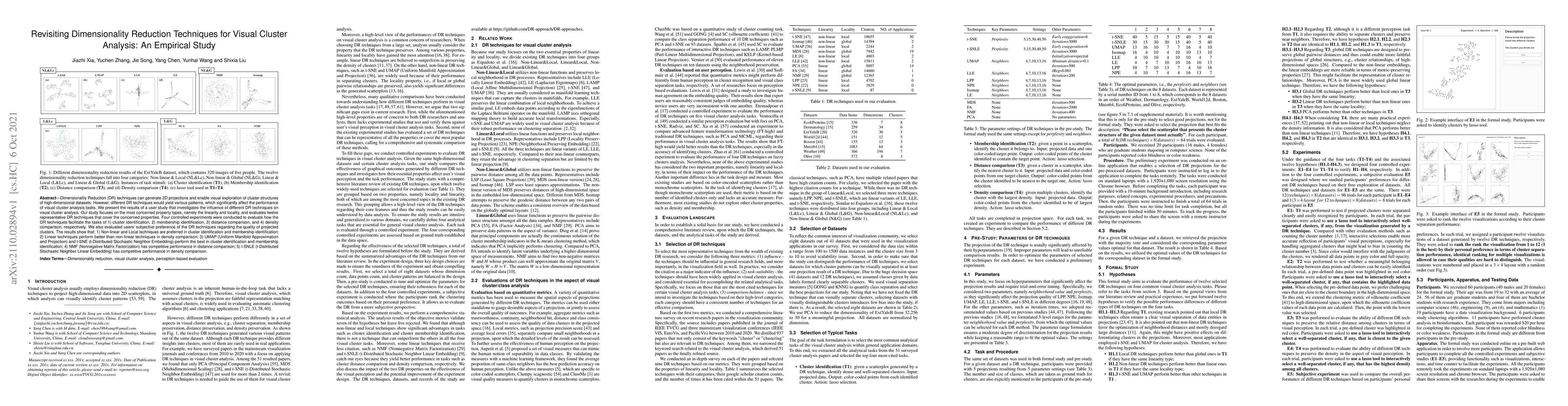 This paper investigates the impact of various Dimensionality Reduction techniques on visual cluster analysis through a user study, focusing on linearity and locality. Results indicate that non-linear and local techniques excel in cluster identification and membership identification, while linear techniques are superior for density comparison. UMAP and t-SNE are top performers for cluster and membership identification, and NMF is competitive for distance comparison.