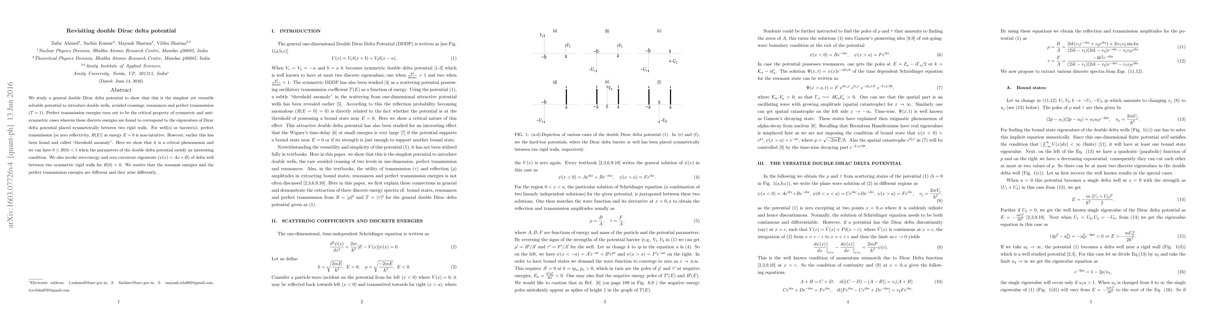 This paper explores the double Dirac delta potential, demonstrating its utility in introducing double wells, avoided crossings, resonances, and perfect transmission ($T=1$). It reveals that perfect transmission energies correspond to eigenvalues of a Dirac delta potential between two rigid walls, and discusses the "threshold anomaly" where zero reflectivity occurs at $E=0$.