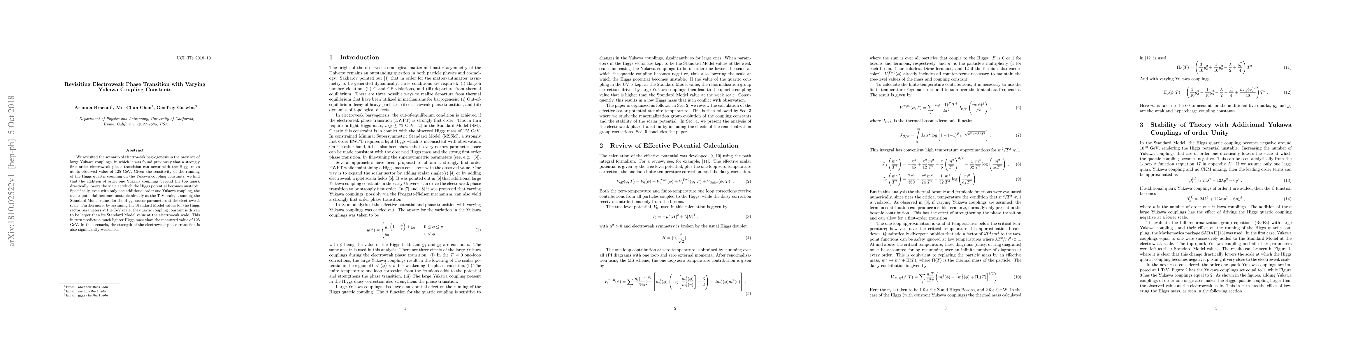 The paper revisits electroweak baryogenesis with large Yukawa couplings, finding that even a single additional order-one Yukawa coupling can destabilize the Higgs potential at the TeV scale. This leads to a predicted Higgs mass lighter than the observed 125 GeV and significantly weakens the strength of the electroweak phase transition.