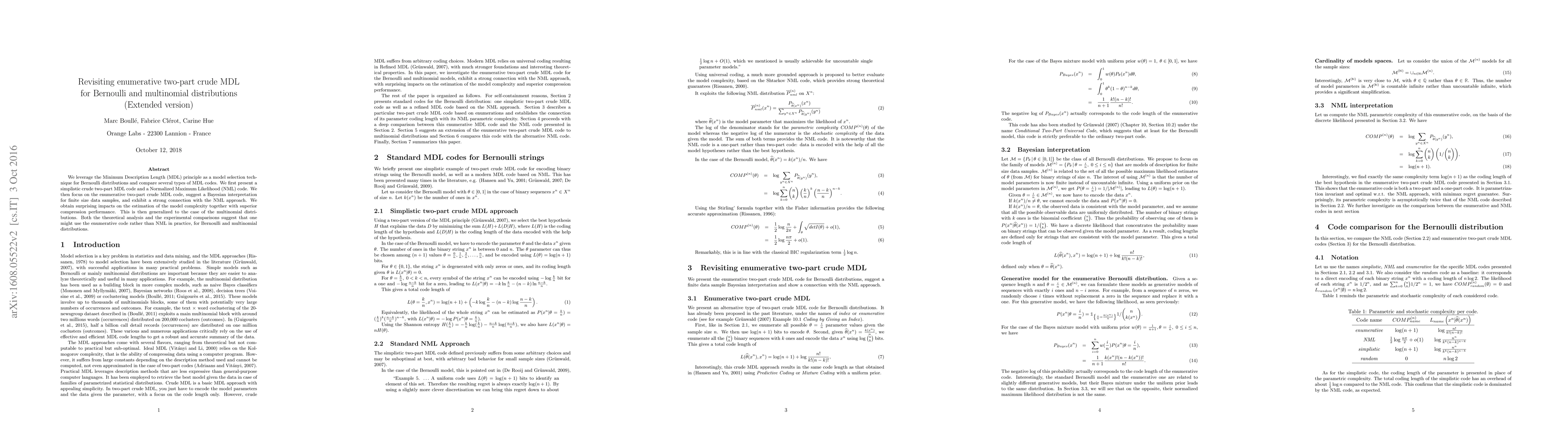 This paper explores the Minimum Description Length (MDL) principle for selecting models for Bernoulli and multinomial distributions, comparing various MDL codes. It proposes an enumerative two-part crude MDL code with a Bayesian interpretation, showing it offers better compression performance and model complexity estimation compared to Normalized Maximum Likelihood (NML) approaches.