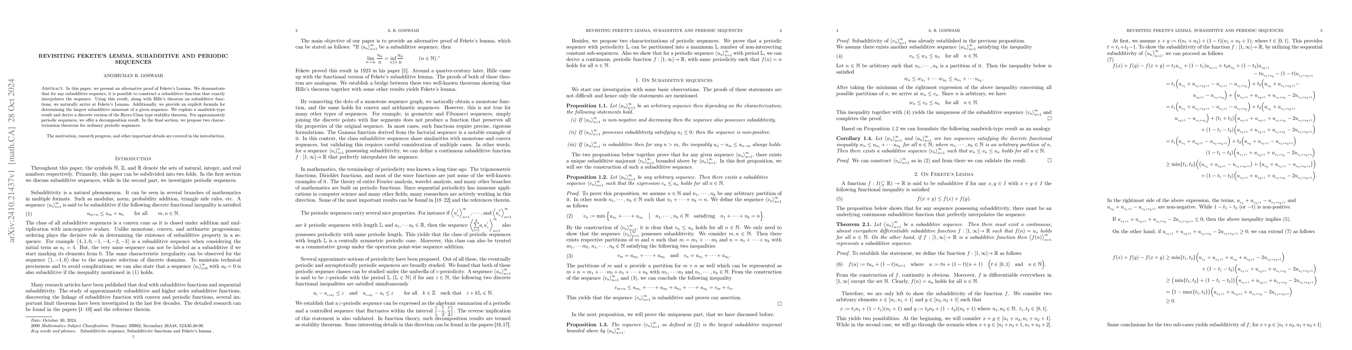 This paper offers an alternative proof of Fekete's Lemma by constructing a subadditive function that interpolates a given subadditive sequence, leading to a new formula for its largest minorant. It also presents a discrete Hyers-Ulam stability theorem and characterization theorems for periodic sequences.