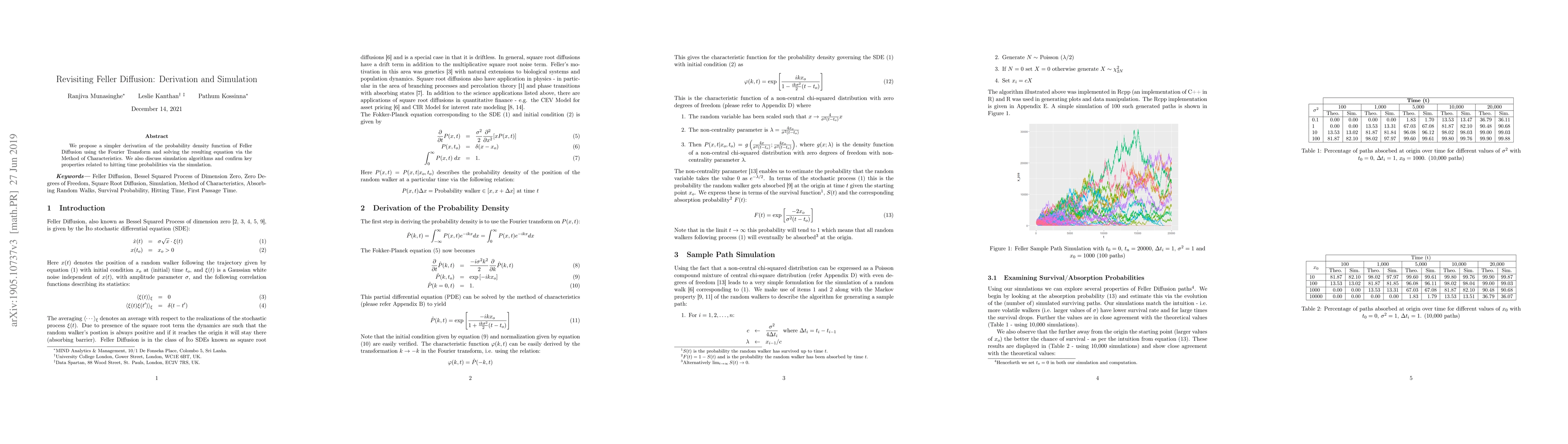 Summary: This paper simplifies the derivation of Feller Diffusion's probability density function using Fourier Transform and the Method of Characteristics, and presents simulation algorithms to verify its hitting time probabilities.