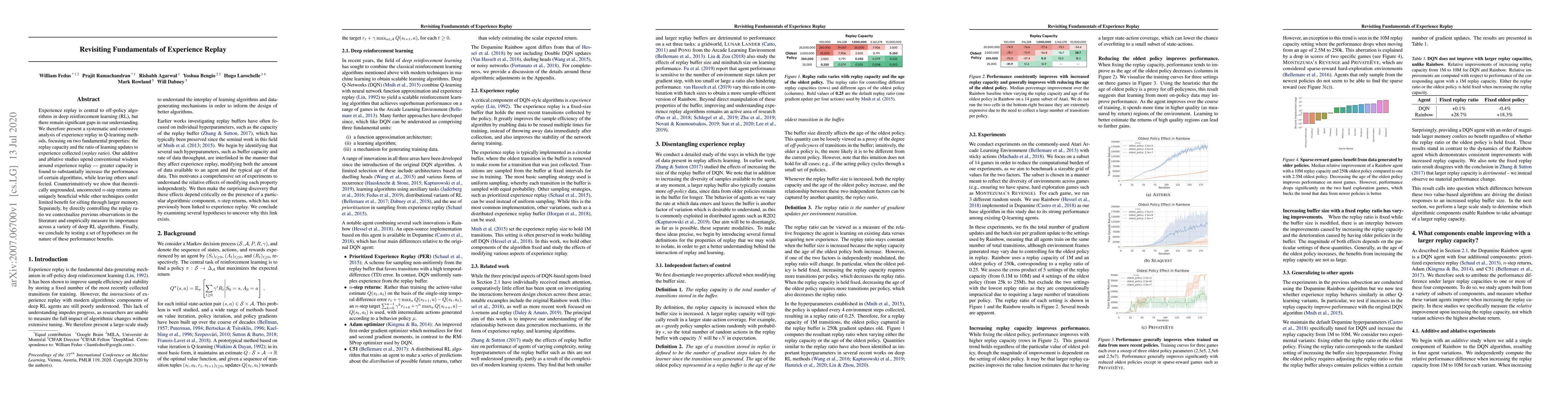 Experience replay is central to off-policy algorithms in deep reinforcement learning (RL), but there remain significant gaps in our understanding. We therefore present a systematic and extensive analysis of experience replay in Q-learning methods, focusing on two fundamental properties: the replay capacity and the ratio of learning updates to experience collected (replay ratio). Our additive and ablative studies upend conventional wisdom around experience replay -- greater capacity is found to substantially increase the performance of certain algorithms, while leaving others unaffected. Counterintuitively we show that theoretically ungrounded, uncorrected n-step returns are uniquely beneficial while other techniques confer limited benefit for sifting through larger memory. Separately, by directly controlling the replay ratio we contextualize previous observations in the literature and empirically measure its importance across a variety of deep RL algorithms. Finally, we conclude by testing a set of hypotheses on the nature of these performance benefits.