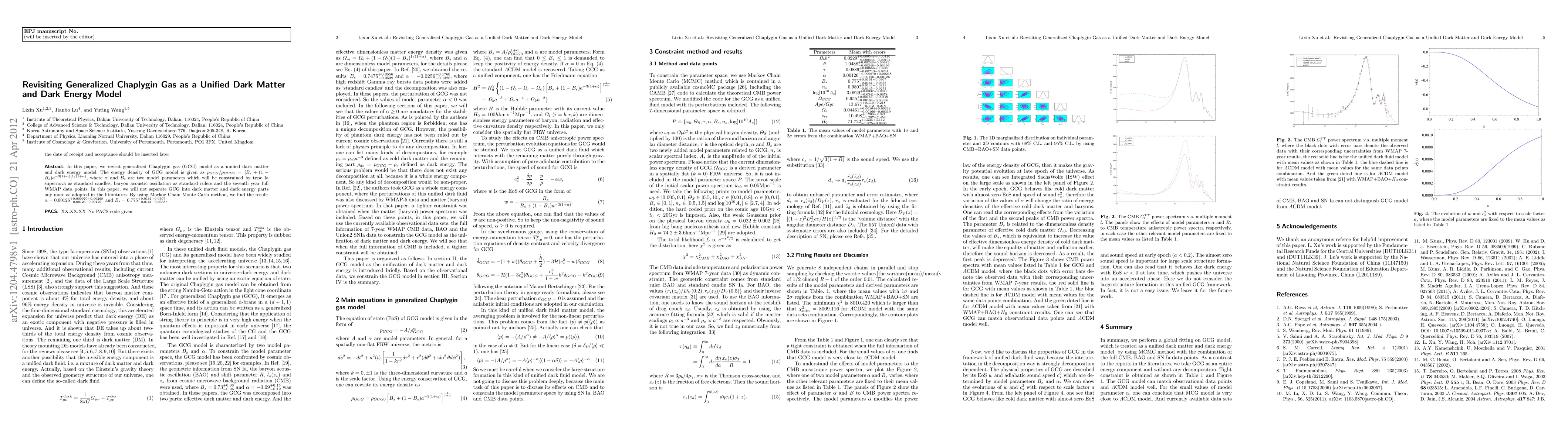 This paper revisits the generalized Chaplygin gas model as a unified framework for dark matter and dark energy, constraining its parameters using observational data. The model's energy density is derived and fitted to data from type Ia supernovae, baryon acoustic oscillations, and WMAP, yielding $\alpha=0.00126 \pm 0.00195$ and $B_s=0.775 \pm 0.030$.