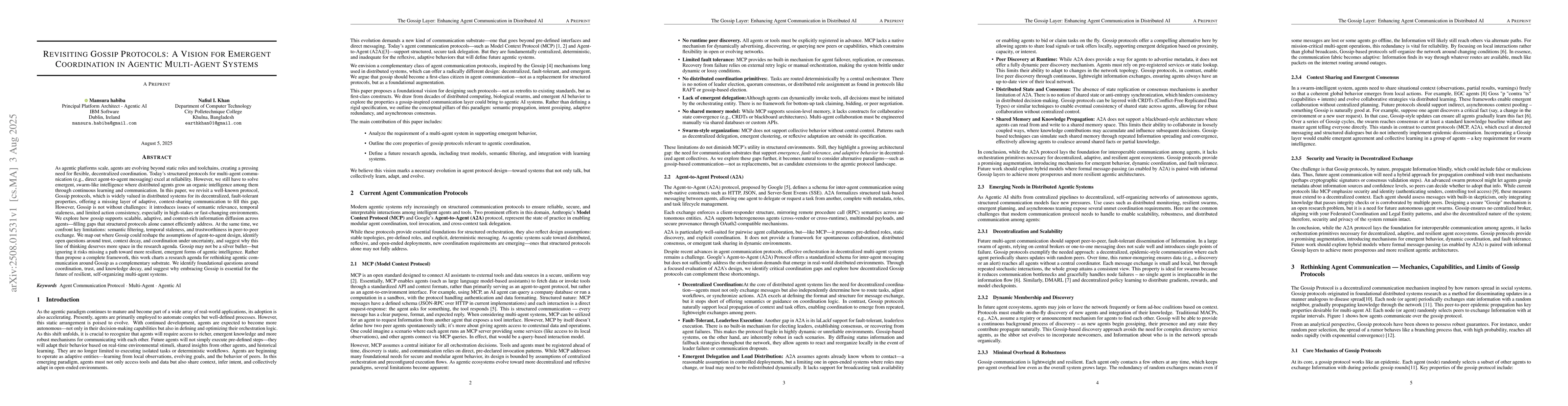 As agentic platforms scale, agents are evolving beyond static roles and fixed toolchains, creating a growing need for flexible, decentralized coordination. Today's structured communication protocols (e.g., direct agent-to-agent messaging) excel at reliability and task delegation, but they fall short in enabling emergent, swarm-like intelligence, where distributed agents continuously learn, adapt, and communicate to form collective cognition. This paper revisits gossip protocols, long valued in distributed systems for their fault tolerance and decentralization, and argues that they offer a missing layer for context-rich, adaptive communication in agentic AI. Gossip enables scalable, low-overhead dissemination of shared knowledge, but also raises unresolved challenges around semantic filtering, staleness, trustworthiness, and consistency in high-stakes environments. Rather than proposing a new framework, this work charts a research agenda for integrating gossip as a complementary substrate alongside structured protocols. We identify critical gaps in current agent-to-agent architectures, highlight where gossip could reshape assumptions about coordination, and outline open questions around intent propagation, knowledge decay, and peer-to-peer trust. Gossip is not a silver bullet, but overlooking it risks missing a key path toward resilient, reflexive, and self-organizing multi-agent systems.