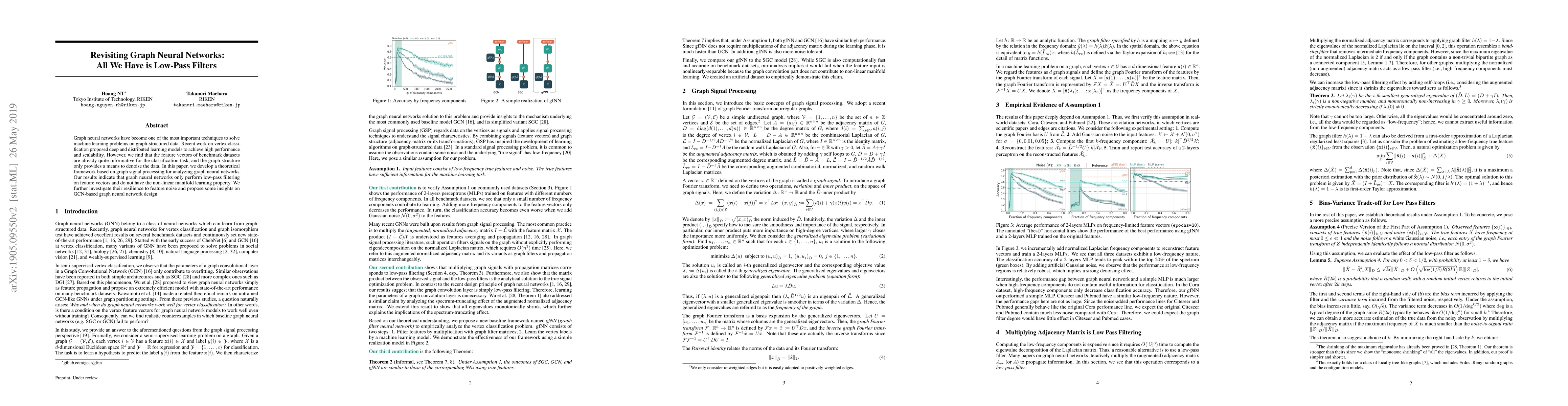 Graph neural networks have become one of the most important techniques to solve machine learning problems on graph-structured data. Recent work on vertex classification proposed deep and distributed learning models to achieve high performance and scalability. However, we find that the feature vectors of benchmark datasets are already quite informative for the classification task, and the graph structure only provides a means to denoise the data. In this paper, we develop a theoretical framework based on graph signal processing for analyzing graph neural networks. Our results indicate that graph neural networks only perform low-pass filtering on feature vectors and do not have the non-linear manifold learning property. We further investigate their resilience to feature noise and propose some insights on GCN-based graph neural network design.