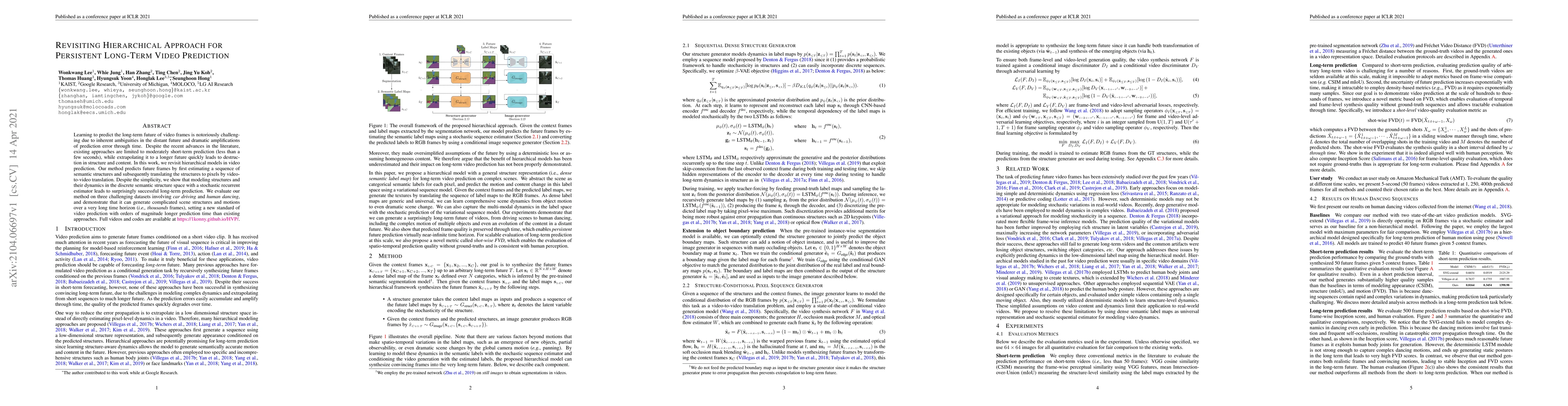 Learning to predict the long-term future of video frames is notoriously challenging due to inherent ambiguities in the distant future and dramatic amplifications of prediction error through time. Despite the recent advances in the literature, existing approaches are limited to moderately short-term prediction (less than a few seconds), while extrapolating it to a longer future quickly leads to destruction in structure and content. In this work, we revisit hierarchical models in video prediction. Our method predicts future frames by first estimating a sequence of semantic structures and subsequently translating the structures to pixels by video-to-video translation. Despite the simplicity, we show that modeling structures and their dynamics in the discrete semantic structure space with a stochastic recurrent estimator leads to surprisingly successful long-term prediction. We evaluate our method on three challenging datasets involving car driving and human dancing, and demonstrate that it can generate complicated scene structures and motions over a very long time horizon (i.e., thousands frames), setting a new standard of video prediction with orders of magnitude longer prediction time than existing approaches. Full videos and codes are available at https://1konny.github.io/HVP/.