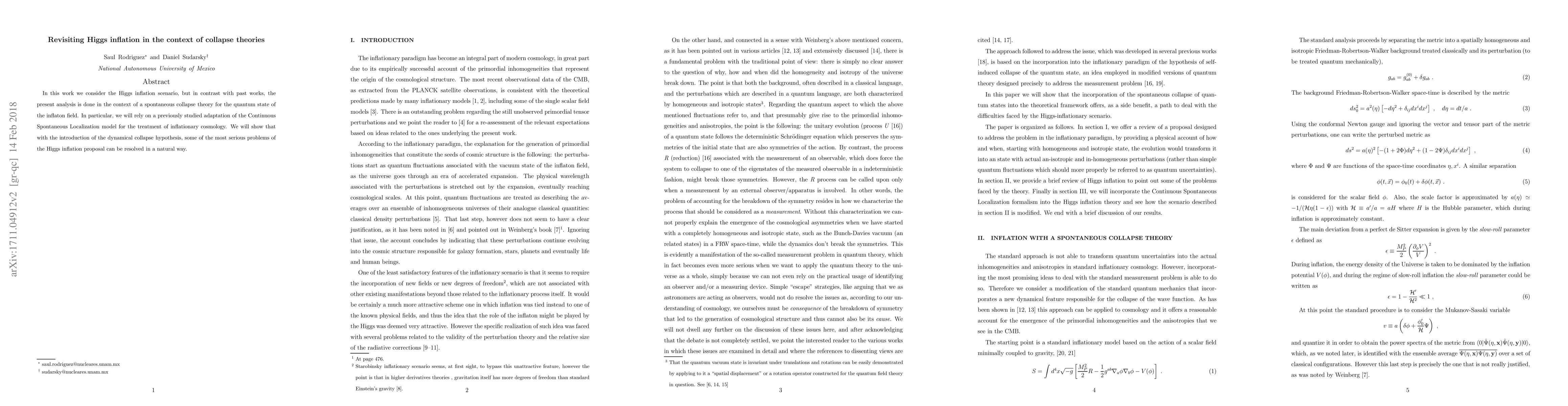 In this work we consider the Higgs inflation scenario, but in contrast with past works, the present analysis is done in the context of a spontaneous collapse theory for the quantum state of the inflaton field. In particular, we will rely on a previously studied adaptation of the Continuous Spontaneous Localization model for the treatment of inflationary cosmology. We will show that with the introduction of the dynamical collapse hypothesis, some of the most serious problems of the Higgs inflation proposal can be resolved in a natural way.