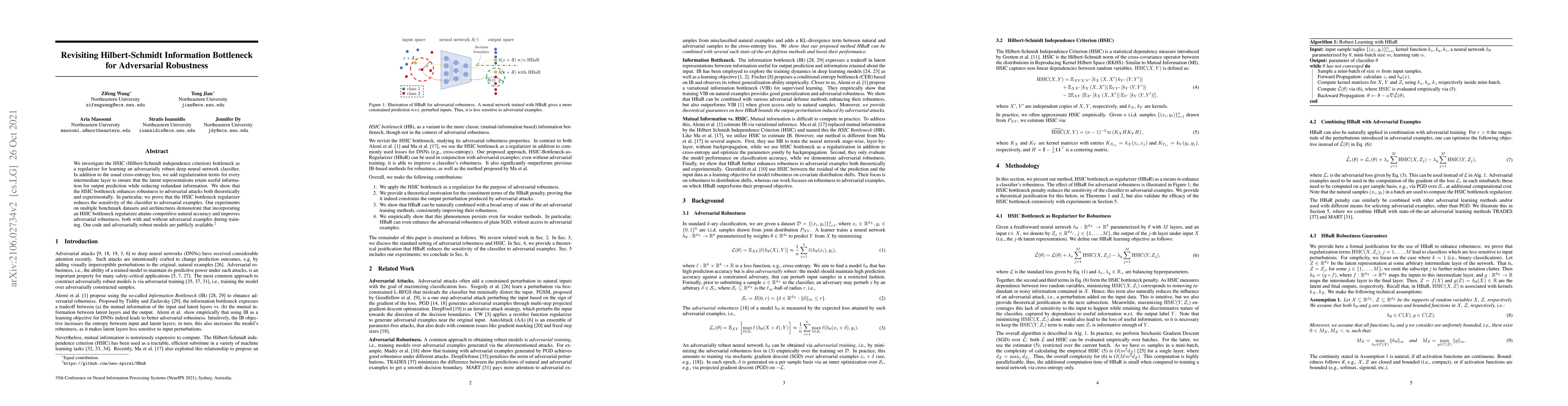 This paper explores the use of the HSIC bottleneck as a regularizer to enhance the adversarial robustness of deep neural networks. The HSIC bottleneck reduces redundant information in latent representations, thereby improving robustness against adversarial attacks, as demonstrated both theoretically and experimentally.