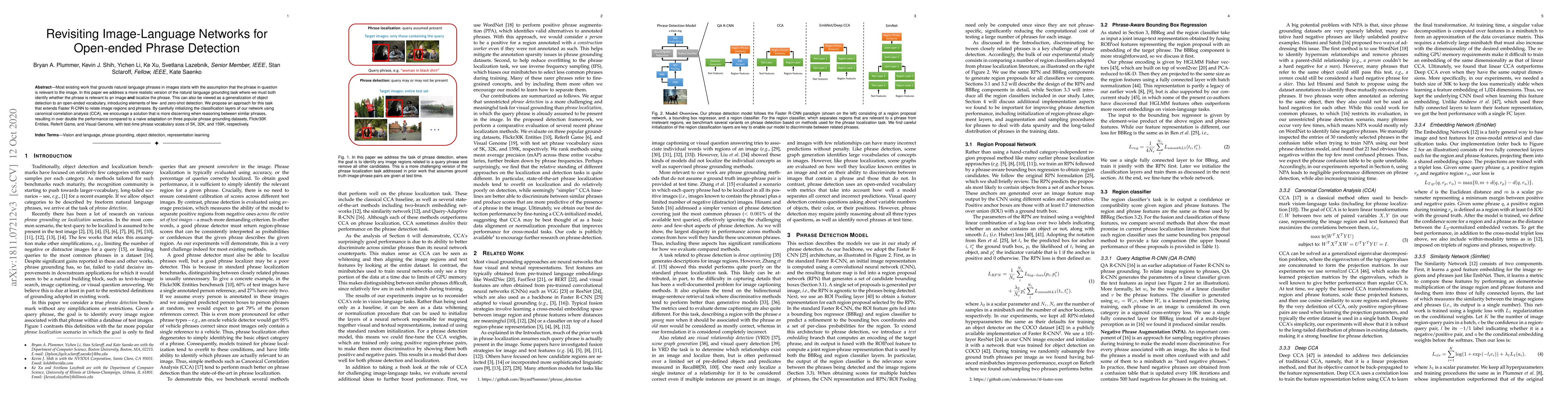 This research proposes a novel approach to identify and localize natural language phrases relevant to images, extending Faster R-CNN to relate image regions and phrases. By utilizing canonical correlation analysis for network initialization, the method significantly outperforms traditional adaptations on several datasets, demonstrating improved performance in open-ended phrase detection.