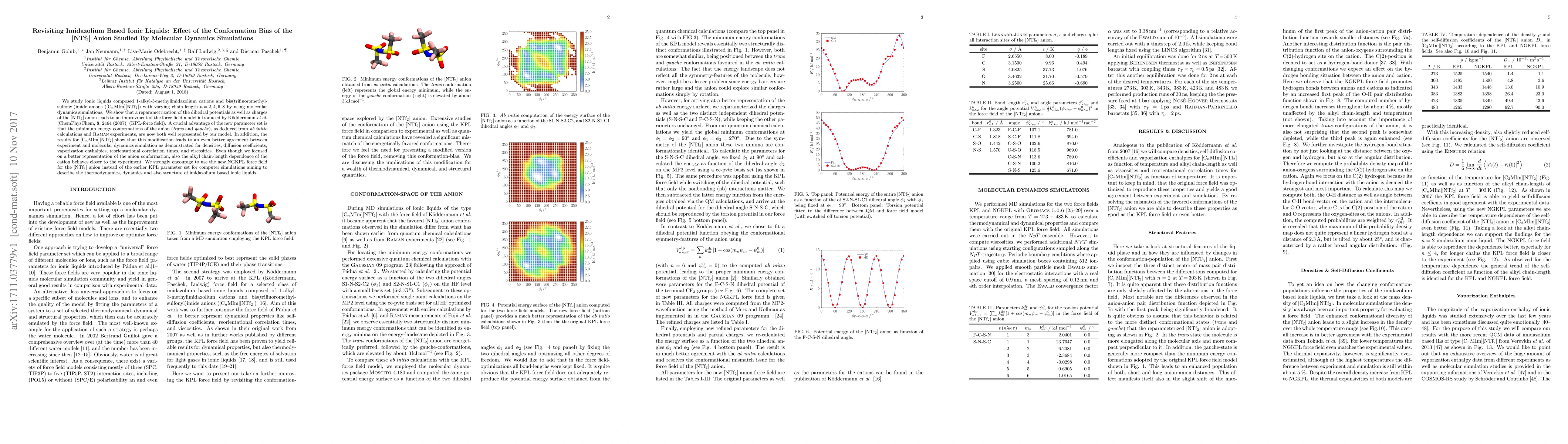 This paper revisits imidazolium-based ionic liquids using molecular dynamics simulations, improving the KPL-force field by reparameterizing the [NTf$_2$] anion's dihedral potentials and charges to better represent its minimum energy conformations. The new NGKPL force field shows enhanced agreement with experimental data for various properties, recommending its use over the previous KPL parameter set.