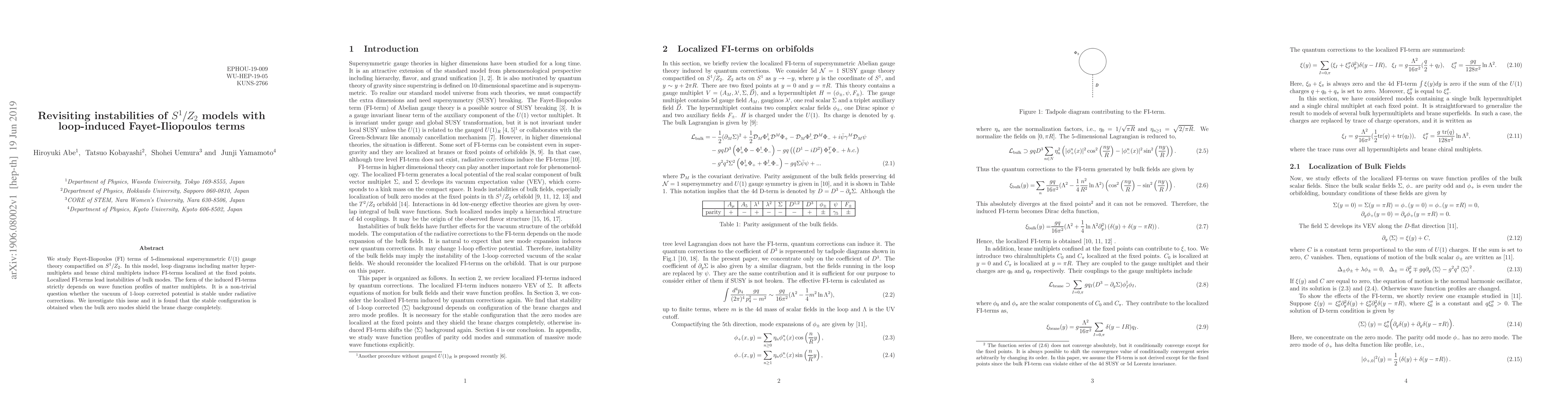 We study Fayet-Iliopoulos (FI) terms of 5-dimensional supersymmetric $U(1)$ gauge theory compactified on $S^1/Z_2$. In this model, loop diagrams including matter hypermultiplets and brane chiral multiplets induce FI-terms localized at the fixed points. Localized FI-terms lead instabilities of bulk modes. The form of the induced FI-terms strictly depends on wave function profiles of matter multiplets. It is a non-trivial question whether the vacuum of 1-loop corrected potential is stable under radiative corrections. We investigate this issue and it is found that the stable configuration is obtained when the bulk zero modes shield the brane charge completely.