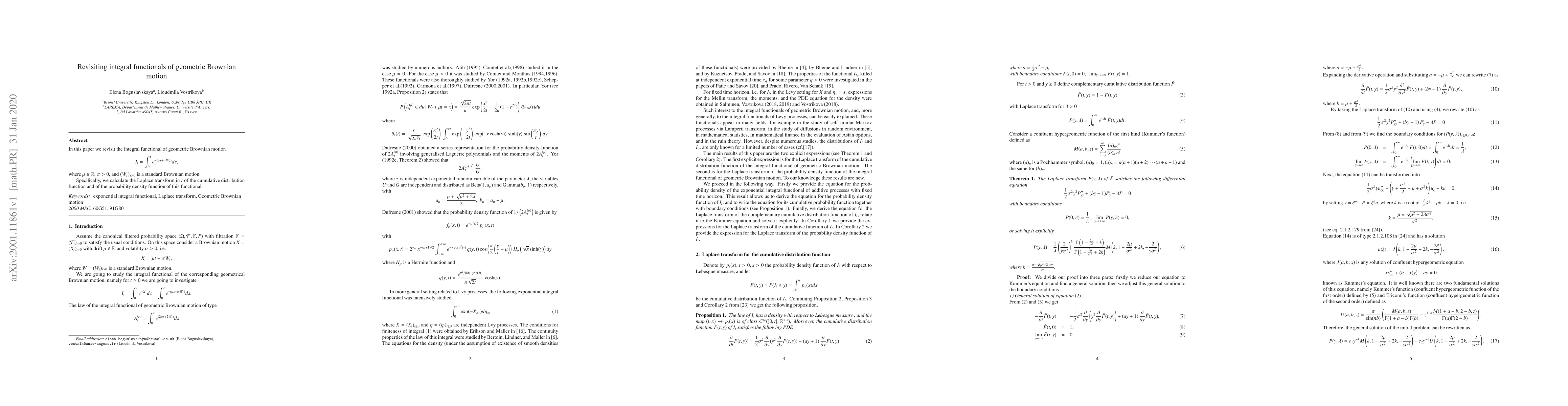 In this paper we revisit the integral functional of geometric Brownian motion $I_t= \int_0^t e^{-(\mu s +\sigma W_s)}ds$, where $\mu\in\mathbb{R}$, $\sigma > 0$, and $(W_s )_s>0$ is a standard Brownian motion. Specifically, we calculate the Laplace transform in $t$ of the cumulative distribution function and of the probability density function of this functional.