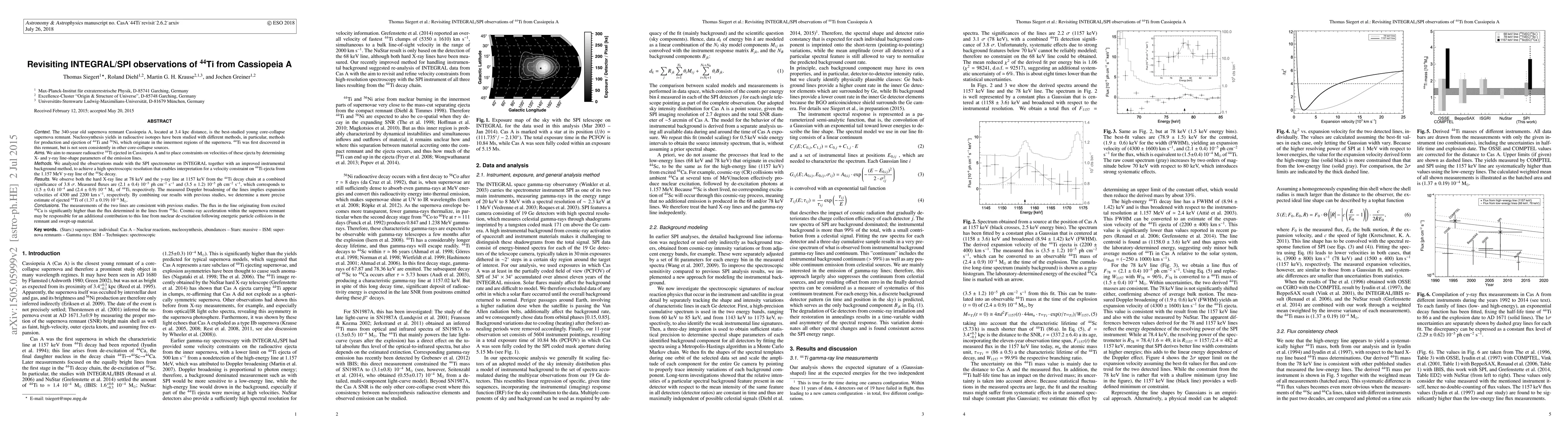 This paper revisits INTEGRAL/SPI observations of $^{44}$Ti in the Cassiopeia A supernova remnant, revealing both hard X-ray and gamma-ray lines with high significance. The study provides a refined estimate of ejected $^{44}$Ti at $(1.37\pm0.19)~10^{-4}~\mathrm{M}_{\odot}$, suggesting cosmic ray acceleration may contribute to the observed gamma-ray line flux.