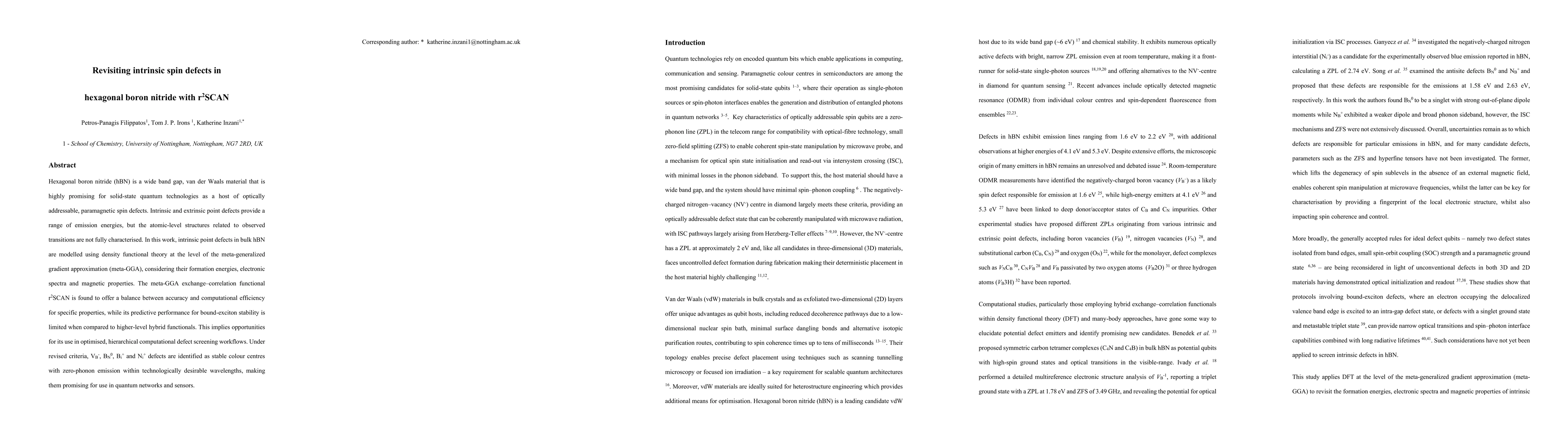 Hexagonal boron nitride (hBN) is a wide band gap, van der Waals material that is highly promising for solid-state quantum technologies as a host of optically addressable, paramagnetic spin defects. Intrinsic and extrinsic point defects provide a range of emission energies, but the atomic-level structures related to observed transitions are not fully characterised. In this work, intrinsic point defects in bulk hBN are modelled using density functional theory at the level of the meta-generalized gradient approximation (meta-GGA), considering their formation energies, electronic spectra and magnetic properties. The meta-GGA exchange-correlation functional r2SCAN is found to offer a balance between accuracy and computational efficiency for specific properties, while its predictive performance for bound-exciton stability is limited when compared to higher-level hybrid functionals. This implies opportunities for its use in optimised, hierarchical computational defect screening workflows. Under revised criteria, VB-, BN0, Bi+ and Ni+ defects are identified as stable colour centres with zero-phonon emission within technologically desirable wavelengths, making them promising for use in quantum networks and sensors.