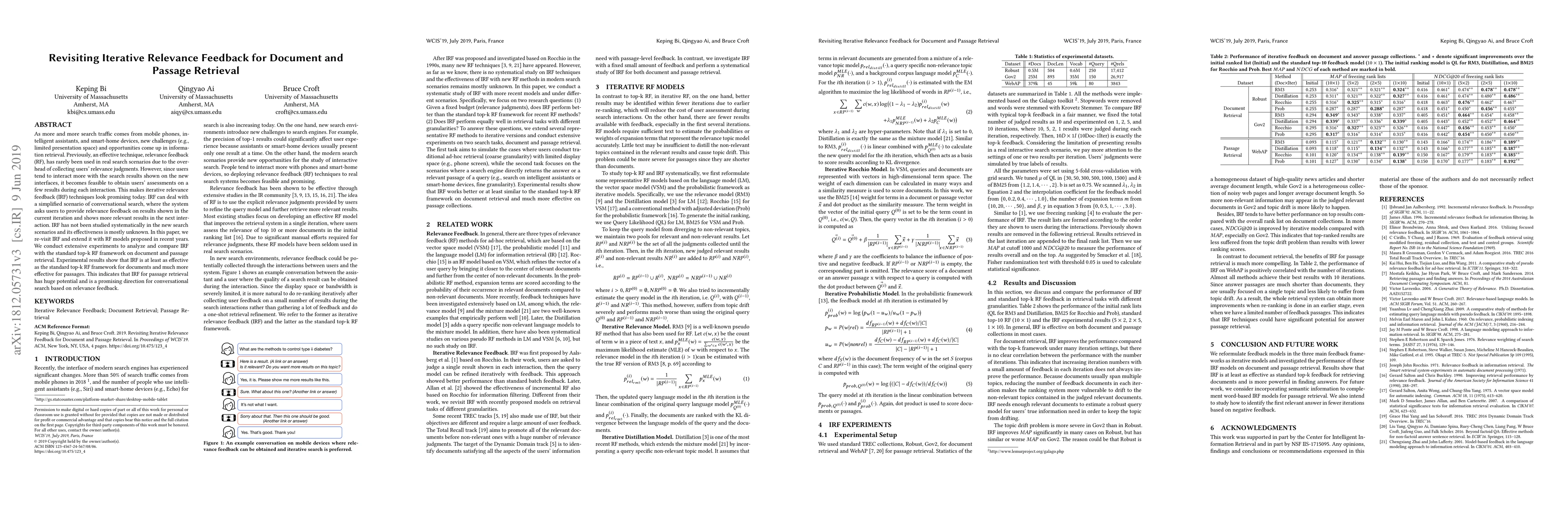 As more and more search traffic comes from mobile phones, intelligent assistants, and smart-home devices, new challenges (e.g., limited presentation space) and opportunities come up in information retrieval. Previously, an effective technique, relevance feedback (RF), has rarely been used in real search scenarios due to the overhead of collecting users' relevance judgments. However, since users tend to interact more with the search results shown on the new interfaces, it becomes feasible to obtain users' assessments on a few results during each interaction. This makes iterative relevance feedback (IRF) techniques look promising today. IRF has not been studied systematically in the new search scenarios and its effectiveness is mostly unknown. In this paper, we re-visit IRF and extend it with RF models proposed in recent years. We conduct extensive experiments to analyze and compare IRF with the standard top-k RF framework on document and passage retrieval. Experimental results show that IRF is at least as effective as the standard top-k RF framework for documents and much more effective for passages. This indicates that IRF for passage retrieval has huge potential.