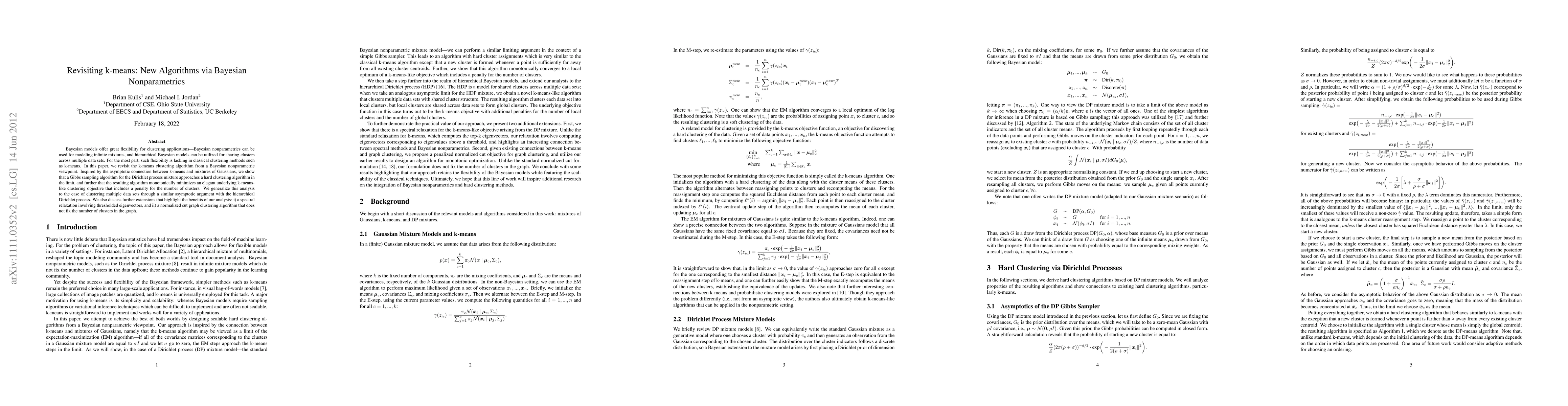 Bayesian models offer great flexibility for clustering applications---Bayesian nonparametrics can be used for modeling infinite mixtures, and hierarchical Bayesian models can be utilized for sharing clusters across multiple data sets. For the most part, such flexibility is lacking in classical clustering methods such as k-means. In this paper, we revisit the k-means clustering algorithm from a Bayesian nonparametric viewpoint. Inspired by the asymptotic connection between k-means and mixtures of Gaussians, we show that a Gibbs sampling algorithm for the Dirichlet process mixture approaches a hard clustering algorithm in the limit, and further that the resulting algorithm monotonically minimizes an elegant underlying k-means-like clustering objective that includes a penalty for the number of clusters. We generalize this analysis to the case of clustering multiple data sets through a similar asymptotic argument with the hierarchical Dirichlet process. We also discuss further extensions that highlight the benefits of our analysis: i) a spectral relaxation involving thresholded eigenvectors, and ii) a normalized cut graph clustering algorithm that does not fix the number of clusters in the graph.