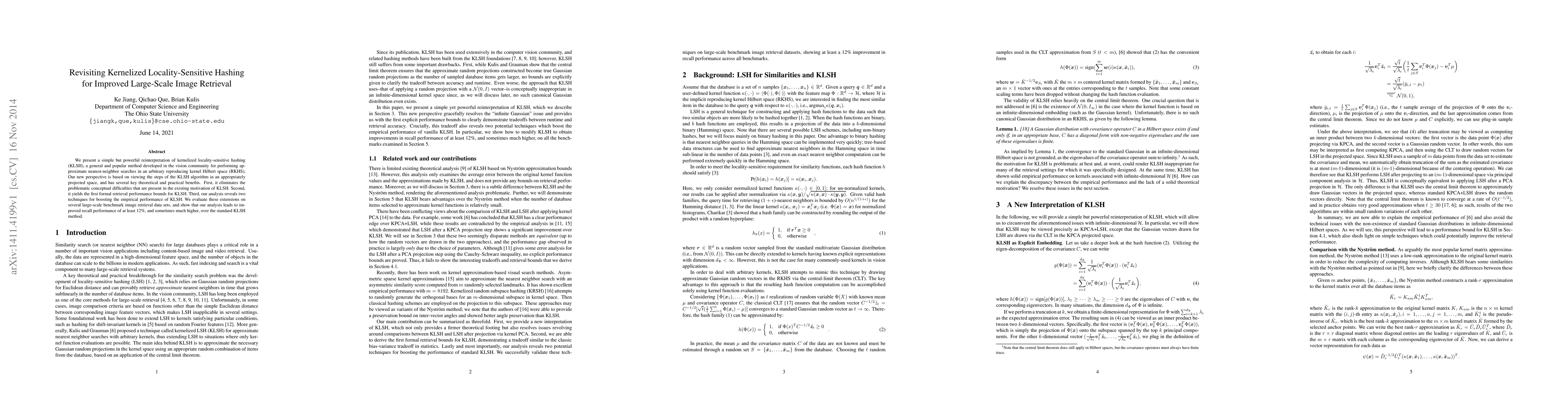 This paper reinterprets kernelized locality-sensitive hashing (KLSH) to address conceptual difficulties and improve large-scale image retrieval. The new approach provides formal performance bounds and techniques that boost empirical results, achieving at least a 12% improvement in recall over standard KLSH.