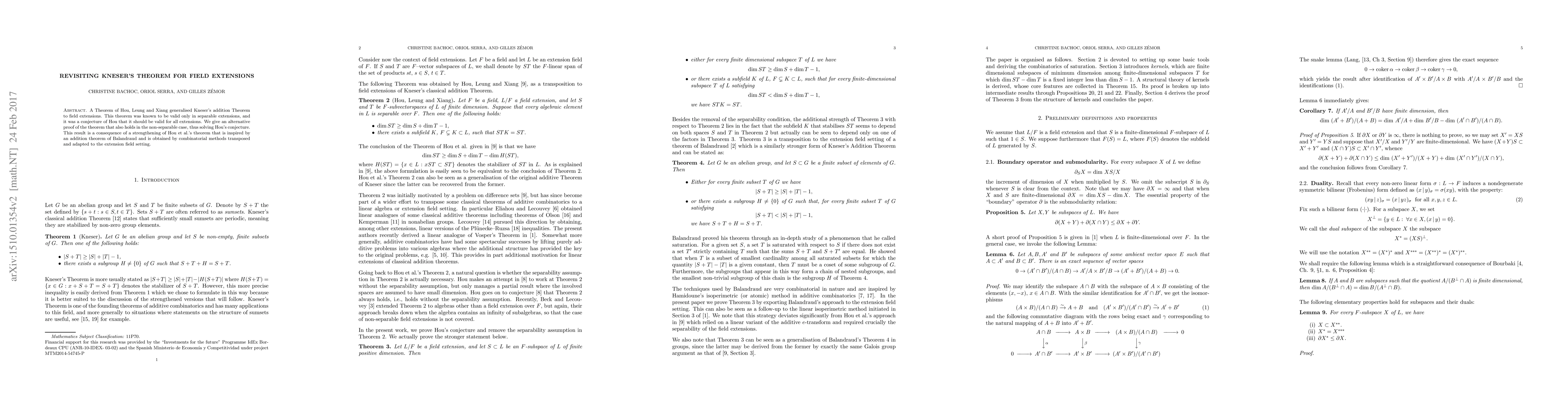 This paper provides an alternative proof of a generalised Kneser's addition theorem, valid for all field extensions, solving Hou's conjecture. The result is achieved by strengthening a previous theorem through a transposition to extension fields.