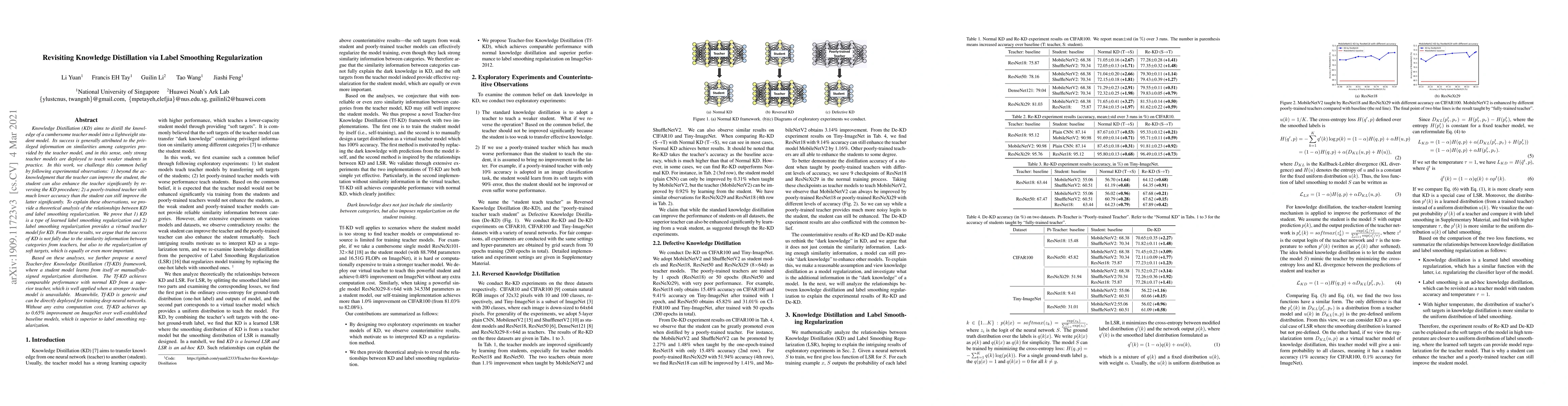 This paper challenges the notion that only strong teacher models are necessary for effective Knowledge Distillation (KD), demonstrating that a poorly-trained teacher can still significantly improve a student model. The authors propose that KD is fundamentally a form of learned label smoothing regularization, and introduce a Teacher-free Knowledge Distillation (Tf-KD) framework that leverages self-learning or manually designed regularization, achieving comparable performance without a stronger teacher model.