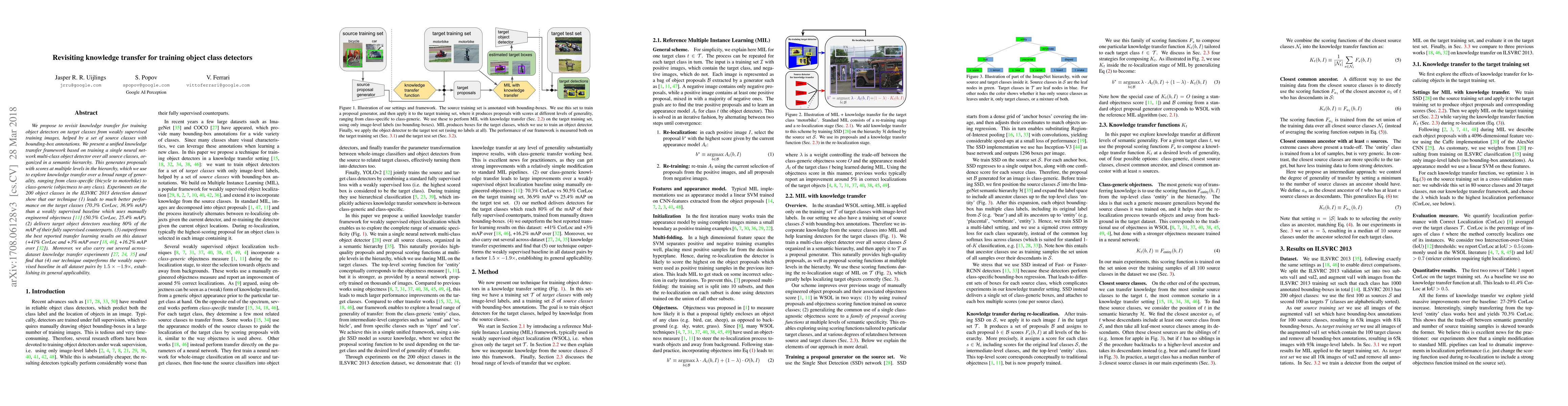 We propose to revisit knowledge transfer for training object detectors on target classes from weakly supervised training images, helped by a set of source classes with bounding-box annotations. We present a unified knowledge transfer framework based on training a single neural network multi-class object detector over all source classes, organized in a semantic hierarchy. This generates proposals with scores at multiple levels in the hierarchy, which we use to explore knowledge transfer over a broad range of generality, ranging from class-specific (bicycle to motorbike) to class-generic (objectness to any class). Experiments on the 200 object classes in the ILSVRC 2013 detection dataset show that our technique: (1) leads to much better performance on the target classes (70.3% CorLoc, 36.9% mAP) than a weakly supervised baseline which uses manually engineered objectness [11] (50.5% CorLoc, 25.4% mAP). (2) delivers target object detectors reaching 80% of the mAP of their fully supervised counterparts. (3) outperforms the best reported transfer learning results on this dataset (+41% CorLoc and +3% mAP over [18, 46], +16.2% mAP over [32]). Moreover, we also carry out several across-dataset knowledge transfer experiments [27, 24, 35] and find that (4) our technique outperforms the weakly supervised baseline in all dataset pairs by 1.5x-1.9x, establishing its general applicability.