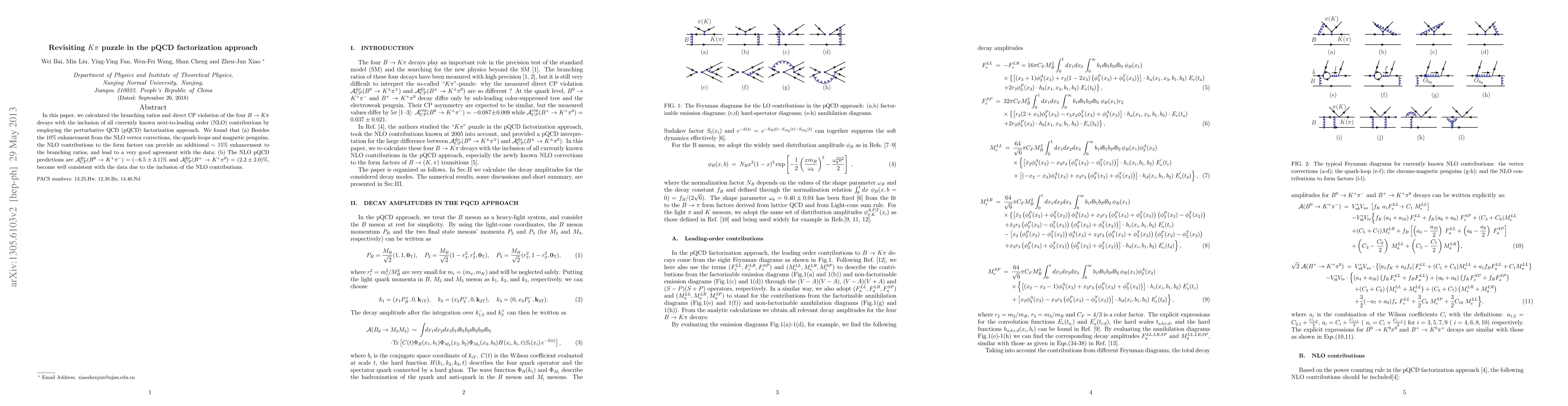This paper revisits the $K\pi$ puzzle using the pQCD factorization approach, finding that next-to-leading order contributions enhance branching ratios by $\sim 35\%$ and align direct CP violation predictions with experimental data.