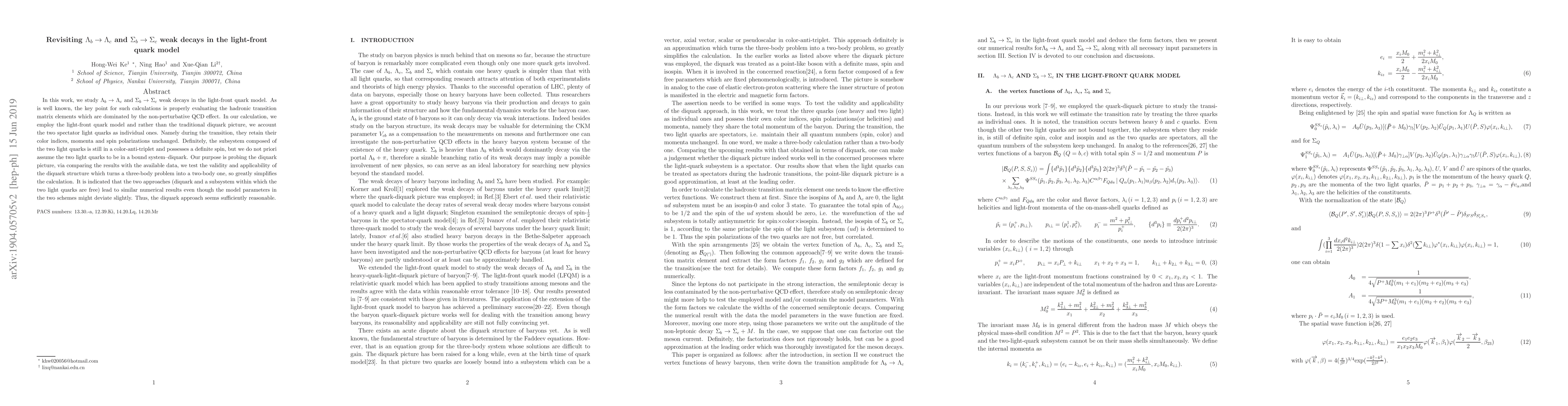 In this work, we study $\Lambda_{b}\to\Lambda_{c}$ and $\Sigma_{b}\to\Sigma_{c}$ weak decays in the light-front quark model. As is well known, the key point for such calculations is properly evaluating the hadronic transition matrix elements which are dominated by the non-perturbative QCD effect. In our calculation, we employ the light-front quark model and rather than the traditional diquark picture, we account the two spectator light quarks as individual ones. Namely during the transition, they retain their color indices, momenta and spin polarizations unchanged. Definitely, the subsystem composed of the two light quarks is still in a color-anti-triplet and possesses a definite spin, but we do not priori assume the two light quarks to be in a bound system-diquark. Our purpose is probing the diquark picture, via comparing the results with the available data, we test the validity and applicability of the diquark structure which turns a three-body problem into a two-body one, so greatly simplifies the calculation. It is indicated that the two approaches (diquark and a subsystem within which the two light quarks are free) lead to similar numerical results even though the model parameters in the two schemes might deviate slightly. Thus, the diquark approach seems sufficiently reasonable.
