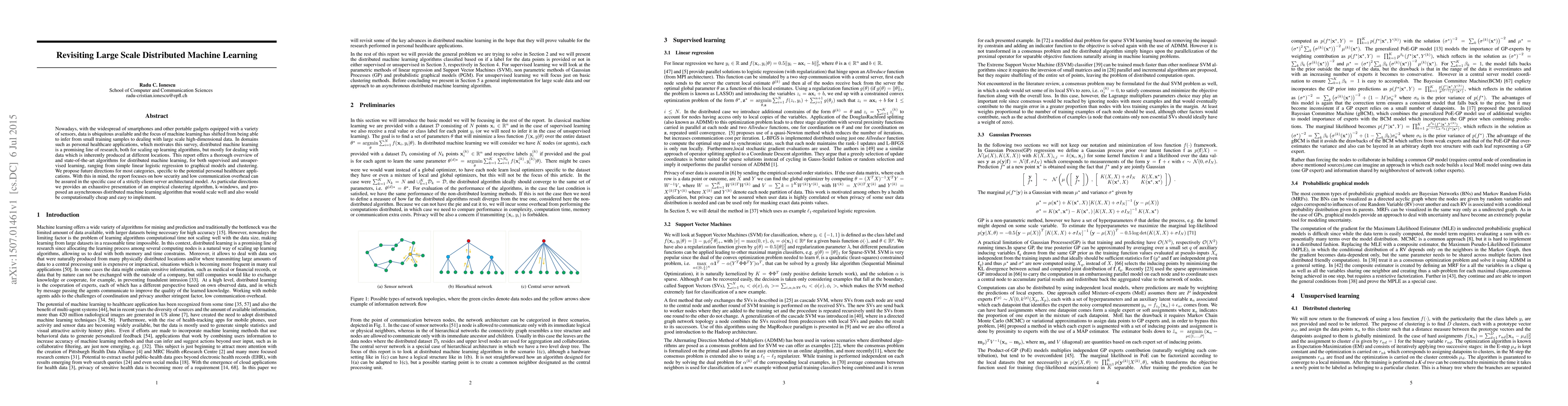 Nowadays, with the widespread of smartphones and other portable gadgets equipped with a variety of sensors, data is ubiquitous available and the focus of machine learning has shifted from being able to infer from small training samples to dealing with large scale high-dimensional data. In domains such as personal healthcare applications, which motivates this survey, distributed machine learning is a promising line of research, both for scaling up learning algorithms, but mostly for dealing with data which is inherently produced at different locations. This report offers a thorough overview of and state-of-the-art algorithms for distributed machine learning, for both supervised and unsupervised learning, ranging from simple linear logistic regression to graphical models and clustering. We propose future directions for most categories, specific to the potential personal healthcare applications. With this in mind, the report focuses on how security and low communication overhead can be assured in the specific case of a strictly client-server architectural model. As particular directions we provides an exhaustive presentation of an empirical clustering algorithm, k-windows, and proposed an asynchronous distributed machine learning algorithm that would scale well and also would be computationally cheap and easy to implement.