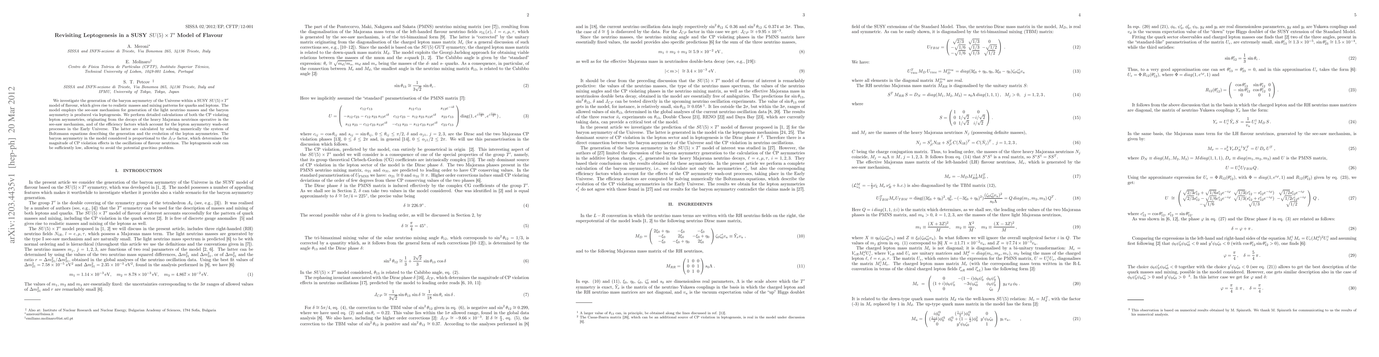 This paper explores how baryon asymmetry in the Universe is generated through leptogenesis in a SUSY SU(5) x T' model, which provides realistic quark and lepton masses and mixing patterns. It uses the see-saw mechanism and detailed numerical calculations to determine CP-violating lepton asymmetries and their wash-out processes.