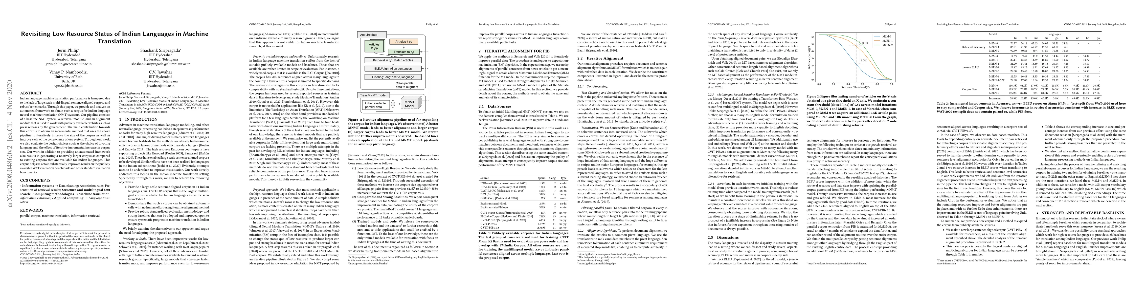Indian language machine translation performance is hampered due to the lack of large scale multi-lingual sentence aligned corpora and robust benchmarks. Through this paper, we provide and analyse an automated framework to obtain such a corpus for Indian language neural machine translation (NMT) systems. Our pipeline consists of a baseline NMT system, a retrieval module, and an alignment module that is used to work with publicly available websites such as press releases by the government. The main contribution towards this effort is to obtain an incremental method that uses the above pipeline to iteratively improve the size of the corpus as well as improve each of the components of our system. Through our work, we also evaluate the design choices such as the choice of pivoting language and the effect of iterative incremental increase in corpus size. Our work in addition to providing an automated framework also results in generating a relatively larger corpus as compared to existing corpora that are available for Indian languages. This corpus helps us obtain substantially improved results on the publicly available WAT evaluation benchmark and other standard evaluation benchmarks.