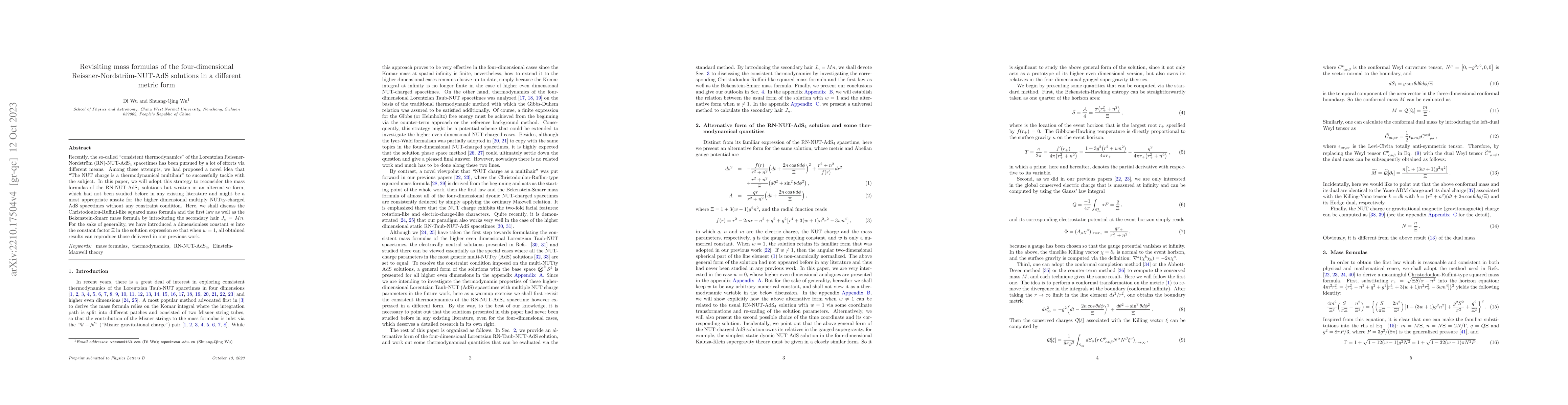 This paper revisits the mass formulas of four-dimensional Reissner-Nordström-NUT-AdS solutions in a novel metric form, proposing that the NUT charge is a thermodynamical multihair. It introduces a secondary hair and a dimensionless constant to generalize the Christodoulou-Ruffini-like squared mass formula and the Bekenstein-Smarr mass formula.