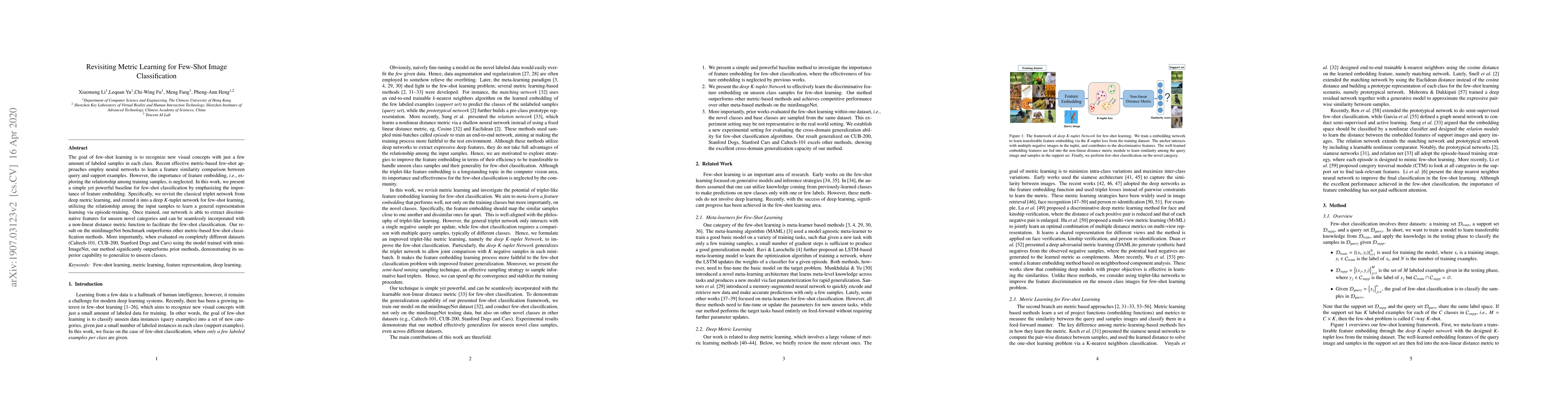 This paper proposes a deep K-tuplet network to enhance feature embedding for few-shot image classification, outperforming other metric-based methods on the miniImageNet benchmark and demonstrating superior generalization to various datasets. The approach leverages the relationship among training samples to learn discriminative features for novel categories.